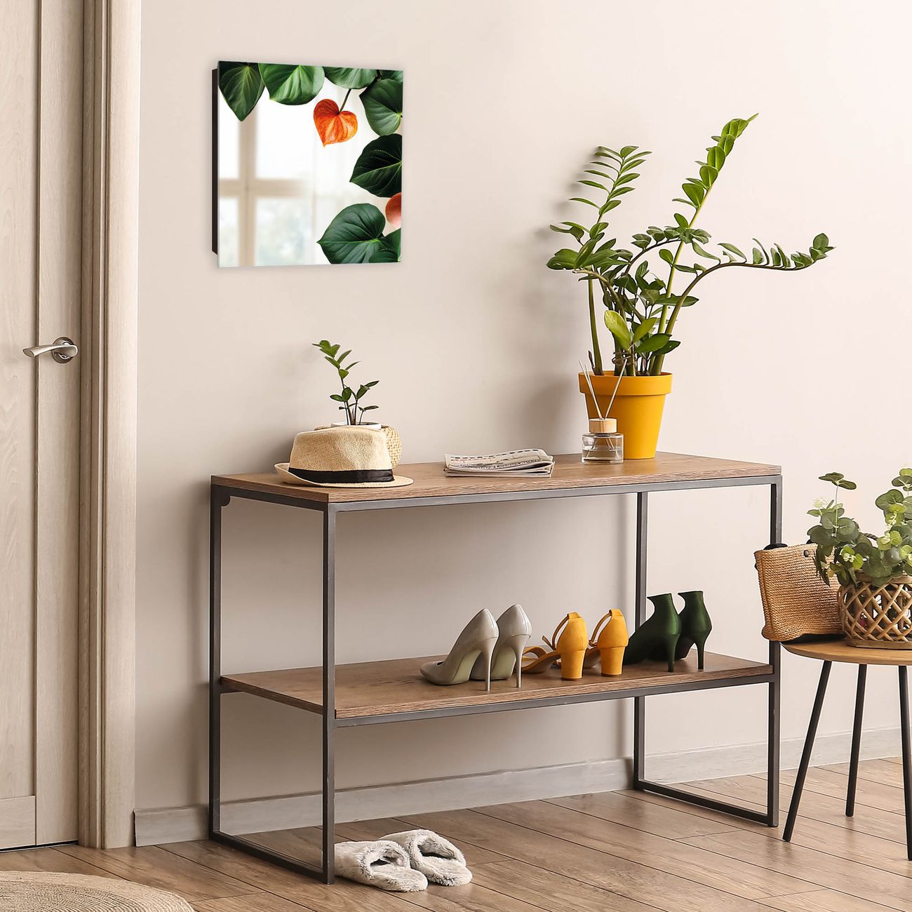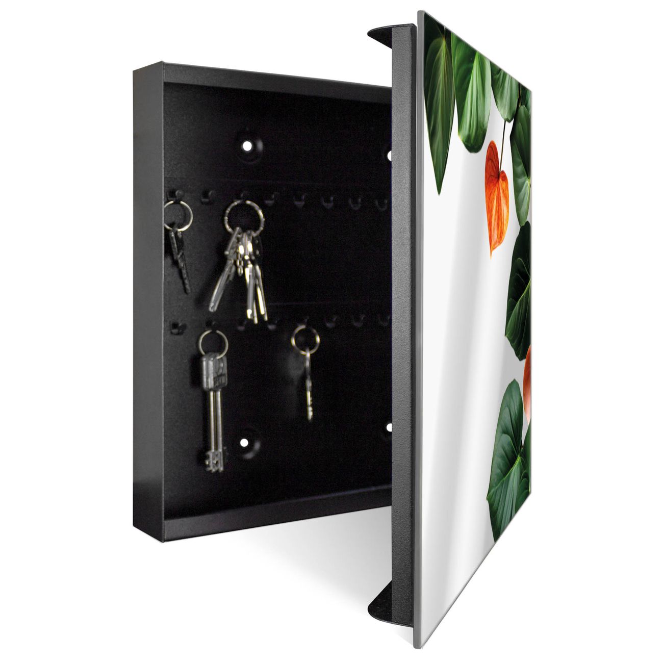 Bringe Ordnung und Stil in deinen Eingangsbereich mit dem banjado Schlüsselkasten mit Spiegel. Die elegante Spiegelfront kombiniert Funktionalität mit modernem Design und macht die Schlüsselaufbewahrung zu einem dekorativen Highlight. ✅ Spiegel Schlüsselaufbewahrung mit Motiv Motiv Tropische Blütenpracht Der Design-Schlüsselkasten Motiv Motiv Tropische Blütenpracht bietet Platz für bis zu 50 Schlüssel, die auf 5 stabilen Reihen mit je 10 Haken übersichtlich verstaut werden. Mit seinen kompakten Maßen von 30 x 30 x 5 cm passt die Schlüsselbox perfekt auch in kleinere Räume. Der schwarz lackierte Stahlkorpus mit rechts angeschlagenem Türscharnier harmoniert mit der Spiegelfront und fügt sich nahtlos in jedes Wohnambiente ein. Ob als Schlüsselorganizer für Zuhause oder als praktische Lösung für Büros, Praxen und Gewerbe, der banjado Schlüsselkasten sorgt für Ordnung und Übersicht. Die Spiegelfront verleiht dem Eingangsbereich zusätzliche Funktionalität und lässt Räume optisch größer wirken. Die Schlüsselbox Motiv Motiv Tropische Blütenpracht zur Wandmontage wird inklusive Befestigungsmaterial geliefert und ist schnell angebracht. So hast du deine Schlüssel jederzeit griffbereit und zugleich stilvoll verstaut. Mit diesem banjado Schlüsselkasten Motiv Motiv Tropische Blütenpracht kombinierst du praktische Aufbewahrung mit stilvollem Wohndesign. Ob privat oder geschäftlich, die Schlüsselbox sorgt für mehr Ordnung, Übersicht und ein wohnliches Ambiente.Vorteile im Überblick