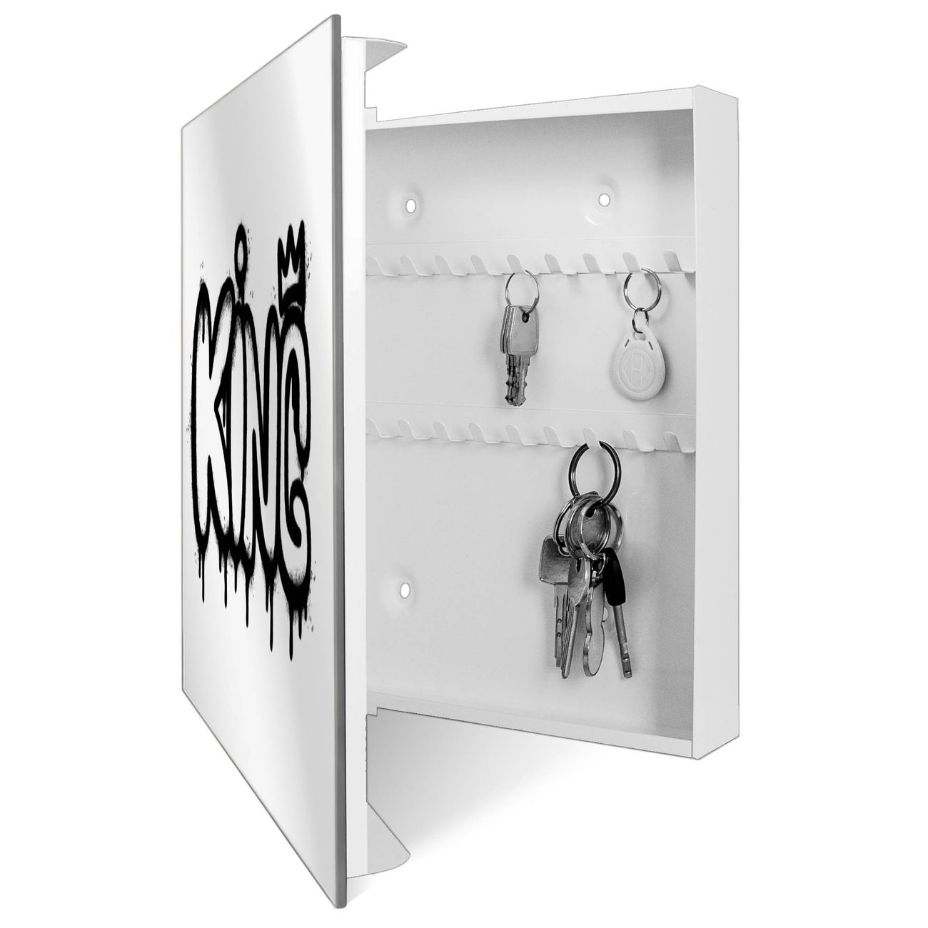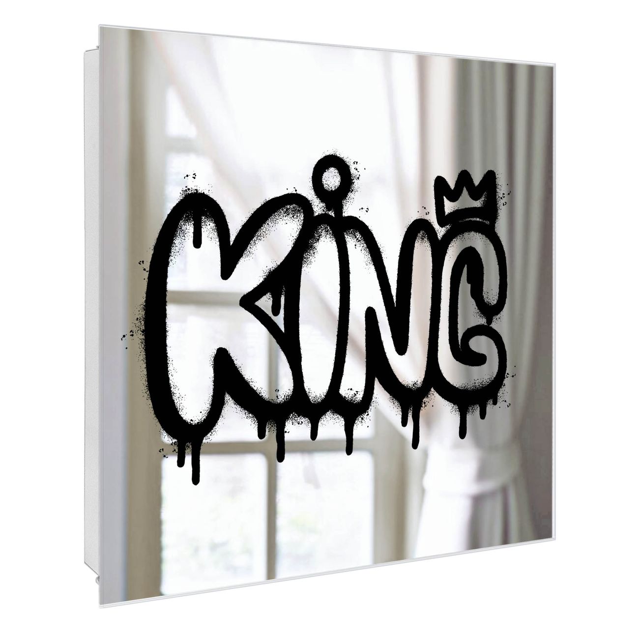 Bringe Ordnung und Stil in deinen Eingangsbereich mit dem banjado Schlüsselkasten mit Spiegel. Die elegante Spiegelfront kombiniert Funktionalität mit modernem Design und macht die Schlüsselaufbewahrung zu einem dekorativen Highlight. ✅ Spiegel Schlüsselaufbewahrung mit Motiv Motiv Urban King Graffiti Der Design-Schlüsselkasten Motiv Motiv Urban King Graffiti bietet Platz für bis zu 50 Schlüssel, die auf 5 stabilen Reihen mit je 10 Haken übersichtlich verstaut werden. Mit seinen kompakten Maßen von 30 x 30 x 5 cm passt die Schlüsselbox perfekt auch in kleinere Räume. Der weiß lackierte Stahlkorpus mit rechts angeschlagenem Türscharnier harmoniert mit der Spiegelfront und fügt sich nahtlos in jedes Wohnambiente ein. Ob als Schlüsselorganizer für Zuhause oder als praktische Lösung für Büros, Praxen und Gewerbe, der banjado Schlüsselkasten sorgt für Ordnung und Übersicht. Die Spiegelfront verleiht dem Eingangsbereich zusätzliche Funktionalität und lässt Räume optisch größer wirken. Die Schlüsselbox Motiv Motiv Urban King Graffiti zur Wandmontage wird inklusive Befestigungsmaterial geliefert und ist schnell angebracht. So hast du deine Schlüssel jederzeit griffbereit und zugleich stilvoll verstaut. Mit diesem banjado Schlüsselkasten Motiv Motiv Urban King Graffiti kombinierst du praktische Aufbewahrung mit stilvollem Wohndesign. Ob privat oder geschäftlich, die Schlüsselbox sorgt für mehr Ordnung, Übersicht und ein wohnliches Ambiente.Vorteile im Überblick