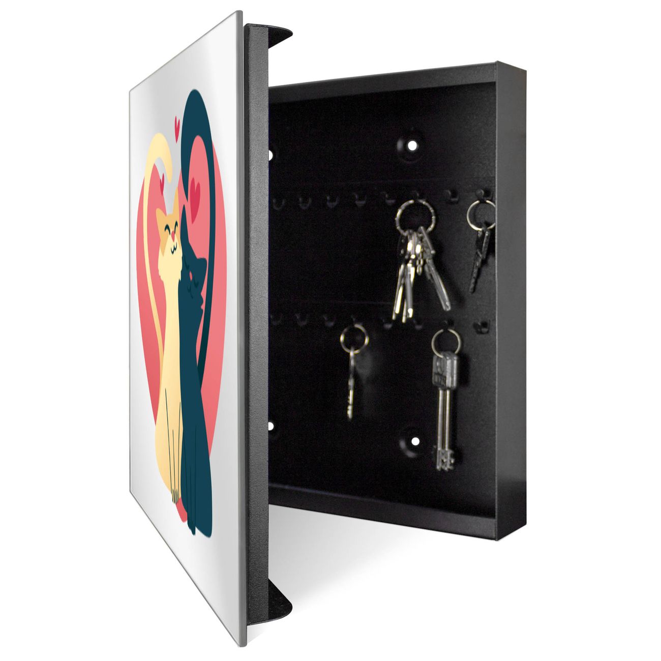 Bringe Ordnung und Stil in deinen Eingangsbereich mit dem banjado Schlüsselkasten mit Spiegel. Die elegante Spiegelfront kombiniert Funktionalität mit modernem Design und macht die Schlüsselaufbewahrung zu einem dekorativen Highlight. ✅ Spiegel Schlüsselaufbewahrung mit Motiv Motiv Verliebte Katzen Der Design-Schlüsselkasten Motiv Motiv Verliebte Katzen bietet Platz für bis zu 50 Schlüssel, die auf 5 stabilen Reihen mit je 10 Haken übersichtlich verstaut werden. Mit seinen kompakten Maßen von 30 x 30 x 5 cm passt die Schlüsselbox perfekt auch in kleinere Räume. Der schwarz lackierte Stahlkorpus mit rechts angeschlagenem Türscharnier harmoniert mit der Spiegelfront und fügt sich nahtlos in jedes Wohnambiente ein. Ob als Schlüsselorganizer für Zuhause oder als praktische Lösung für Büros, Praxen und Gewerbe, der banjado Schlüsselkasten sorgt für Ordnung und Übersicht. Die Spiegelfront verleiht dem Eingangsbereich zusätzliche Funktionalität und lässt Räume optisch größer wirken. Die Schlüsselbox Motiv Motiv Verliebte Katzen zur Wandmontage wird inklusive Befestigungsmaterial geliefert und ist schnell angebracht. So hast du deine Schlüssel jederzeit griffbereit und zugleich stilvoll verstaut. Mit diesem banjado Schlüsselkasten Motiv Motiv Verliebte Katzen kombinierst du praktische Aufbewahrung mit stilvollem Wohndesign. Ob privat oder geschäftlich, die Schlüsselbox sorgt für mehr Ordnung, Übersicht und ein wohnliches Ambiente.Vorteile im Überblick