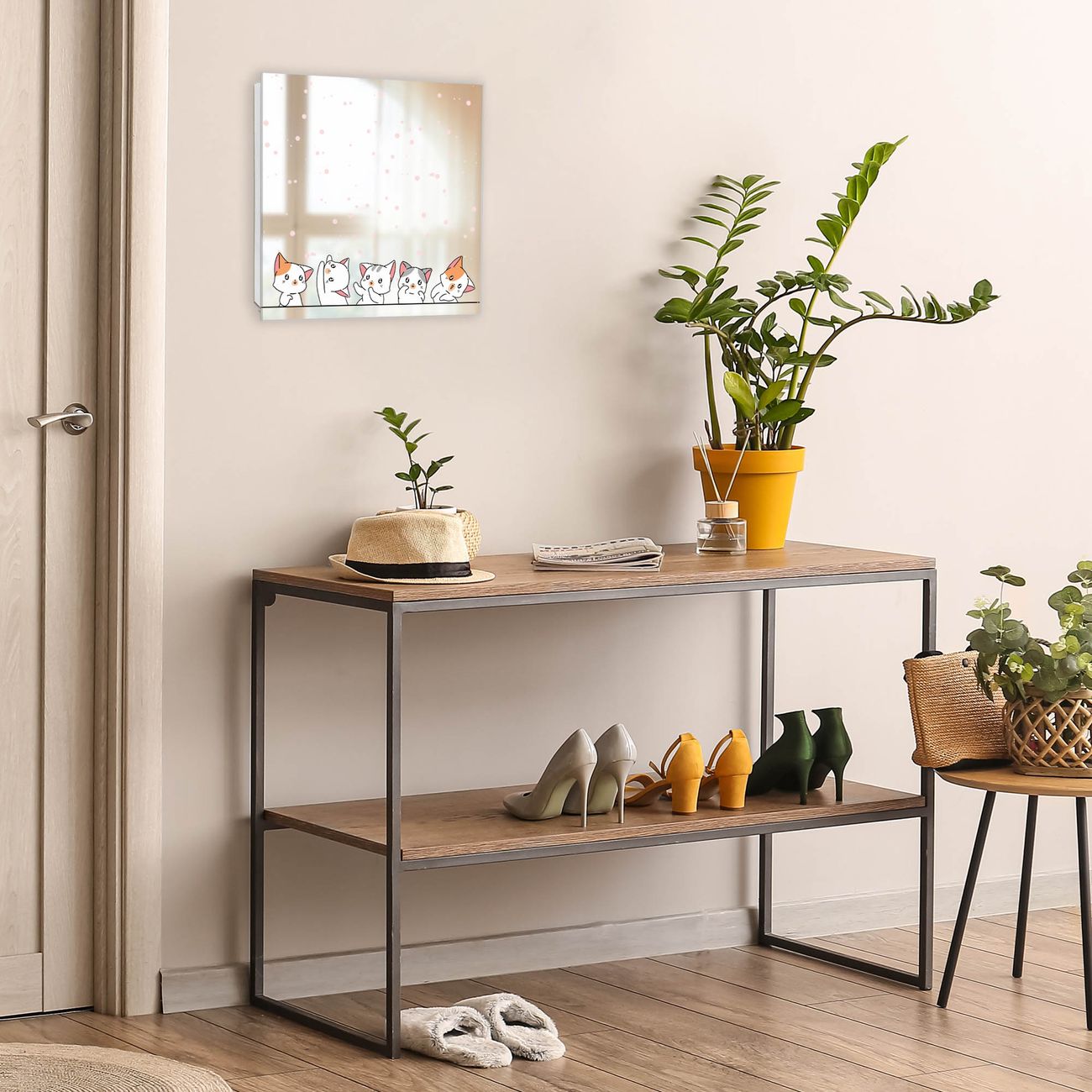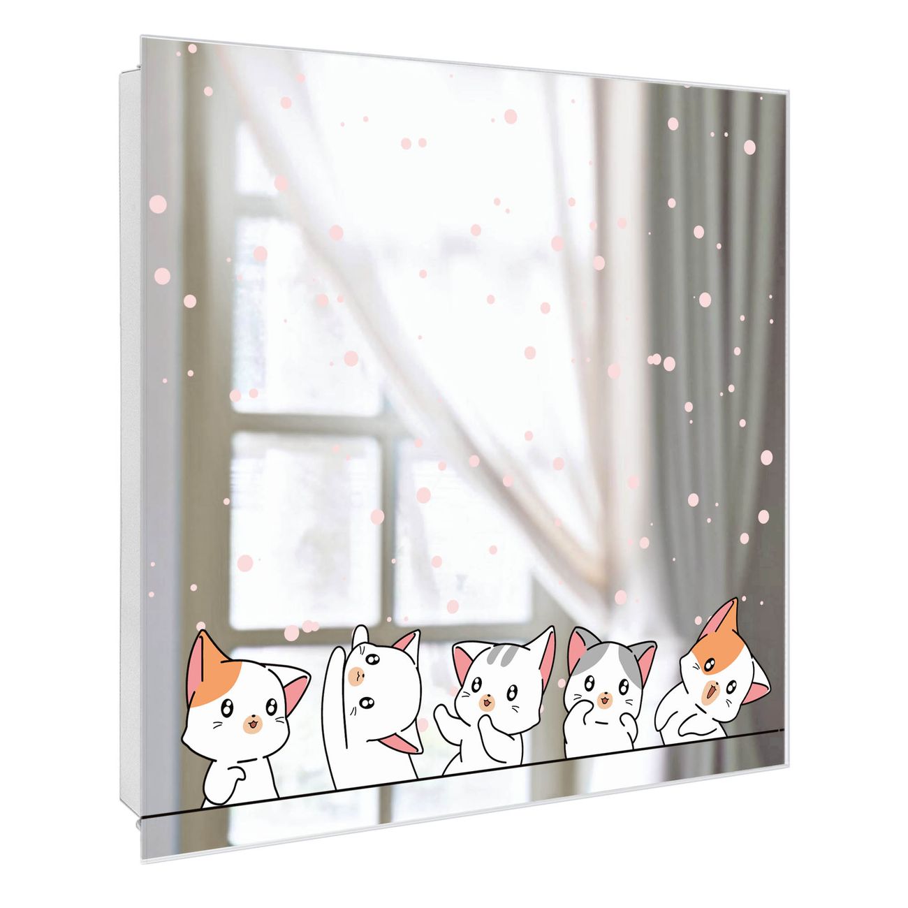Bringe Ordnung und Stil in deinen Eingangsbereich mit dem banjado Schlüsselkasten mit Spiegel. Die elegante Spiegelfront kombiniert Funktionalität mit modernem Design und macht die Schlüsselaufbewahrung zu einem dekorativen Highlight. ✅ Spiegel Schlüsselaufbewahrung mit Motiv Motiv Verspielte Kätzchen Der Design-Schlüsselkasten Motiv Motiv Verspielte Kätzchen bietet Platz für bis zu 50 Schlüssel, die auf 5 stabilen Reihen mit je 10 Haken übersichtlich verstaut werden. Mit seinen kompakten Maßen von 30 x 30 x 5 cm passt die Schlüsselbox perfekt auch in kleinere Räume. Der weiß lackierte Stahlkorpus mit rechts angeschlagenem Türscharnier harmoniert mit der Spiegelfront und fügt sich nahtlos in jedes Wohnambiente ein. Ob als Schlüsselorganizer für Zuhause oder als praktische Lösung für Büros, Praxen und Gewerbe, der banjado Schlüsselkasten sorgt für Ordnung und Übersicht. Die Spiegelfront verleiht dem Eingangsbereich zusätzliche Funktionalität und lässt Räume optisch größer wirken. Die Schlüsselbox Motiv Motiv Verspielte Kätzchen zur Wandmontage wird inklusive Befestigungsmaterial geliefert und ist schnell angebracht. So hast du deine Schlüssel jederzeit griffbereit und zugleich stilvoll verstaut. Mit diesem banjado Schlüsselkasten Motiv Motiv Verspielte Kätzchen kombinierst du praktische Aufbewahrung mit stilvollem Wohndesign. Ob privat oder geschäftlich, die Schlüsselbox sorgt für mehr Ordnung, Übersicht und ein wohnliches Ambiente.Vorteile im Überblick