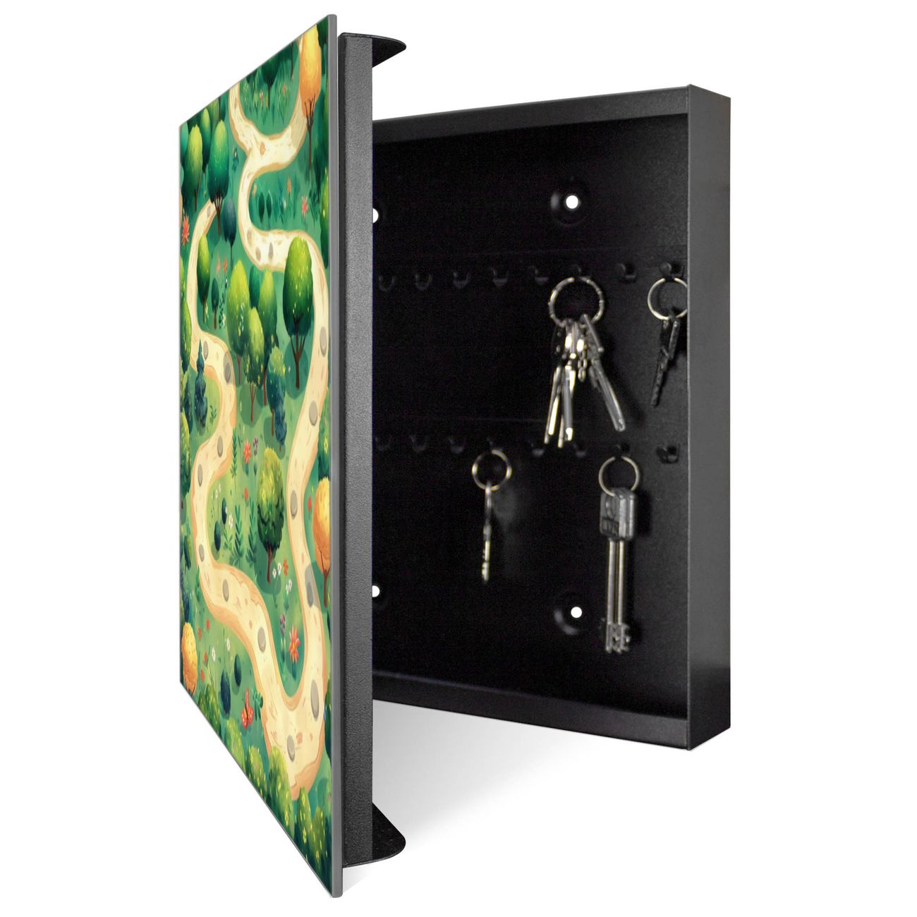 Bringe Ordnung und Stil in deinen Eingangsbereich mit dem banjado Schlüsselkasten mit Spiegel. Die elegante Spiegelfront kombiniert Funktionalität mit modernem Design und macht die Schlüsselaufbewahrung zu einem dekorativen Highlight. ✅ Spiegel Schlüsselaufbewahrung mit Motiv Motiv Waldweg Der Design-Schlüsselkasten Motiv Motiv Waldweg bietet Platz für bis zu 50 Schlüssel, die auf 5 stabilen Reihen mit je 10 Haken übersichtlich verstaut werden. Mit seinen kompakten Maßen von 30 x 30 x 5 cm passt die Schlüsselbox perfekt auch in kleinere Räume. Der schwarz lackierte Stahlkorpus mit rechts angeschlagenem Türscharnier harmoniert mit der Spiegelfront und fügt sich nahtlos in jedes Wohnambiente ein. Ob als Schlüsselorganizer für Zuhause oder als praktische Lösung für Büros, Praxen und Gewerbe, der banjado Schlüsselkasten sorgt für Ordnung und Übersicht. Die Spiegelfront verleiht dem Eingangsbereich zusätzliche Funktionalität und lässt Räume optisch größer wirken. Die Schlüsselbox Motiv Motiv Waldweg zur Wandmontage wird inklusive Befestigungsmaterial geliefert und ist schnell angebracht. So hast du deine Schlüssel jederzeit griffbereit und zugleich stilvoll verstaut. Mit diesem banjado Schlüsselkasten Motiv Motiv Waldweg kombinierst du praktische Aufbewahrung mit stilvollem Wohndesign. Ob privat oder geschäftlich, die Schlüsselbox sorgt für mehr Ordnung, Übersicht und ein wohnliches Ambiente.Vorteile im Überblick