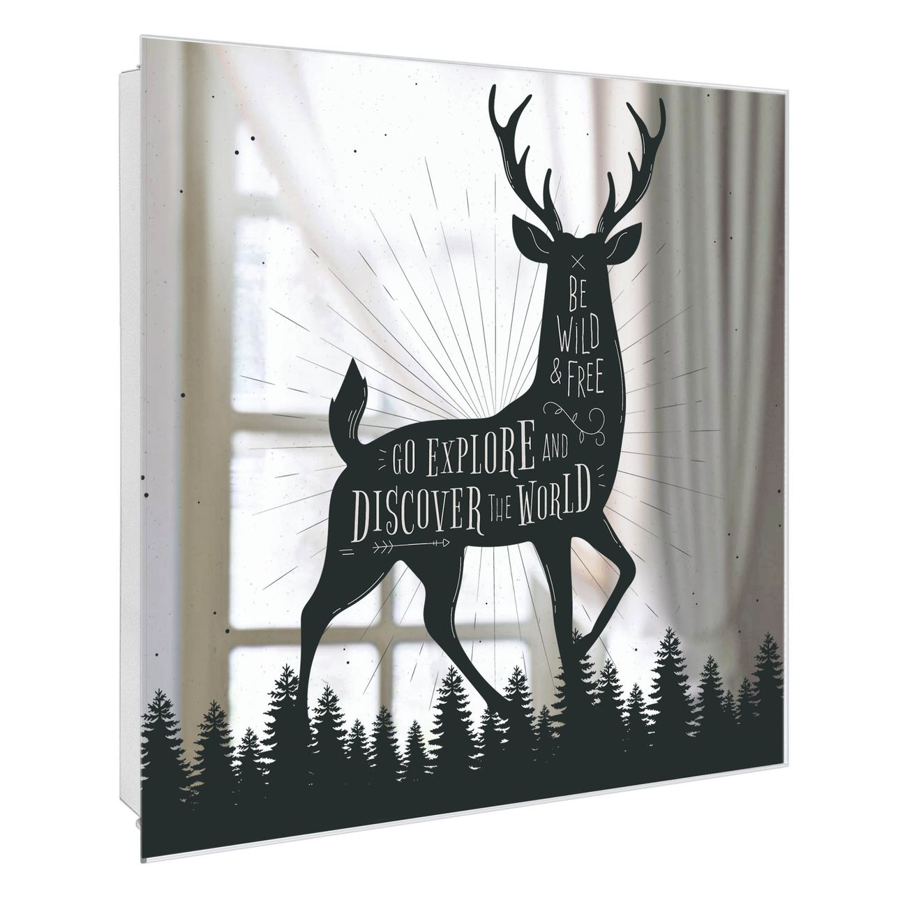 Bringe Ordnung und Stil in deinen Eingangsbereich mit dem banjado Schlüsselkasten mit Spiegel. Die elegante Spiegelfront kombiniert Funktionalität mit modernem Design und macht die Schlüsselaufbewahrung zu einem dekorativen Highlight. ✅ Spiegel Schlüsselaufbewahrung mit Motiv Motiv Wilder Hirsch Der Design-Schlüsselkasten Motiv Motiv Wilder Hirsch bietet Platz für bis zu 50 Schlüssel, die auf 5 stabilen Reihen mit je 10 Haken übersichtlich verstaut werden. Mit seinen kompakten Maßen von 30 x 30 x 5 cm passt die Schlüsselbox perfekt auch in kleinere Räume. Der weiß lackierte Stahlkorpus mit rechts angeschlagenem Türscharnier harmoniert mit der Spiegelfront und fügt sich nahtlos in jedes Wohnambiente ein. Ob als Schlüsselorganizer für Zuhause oder als praktische Lösung für Büros, Praxen und Gewerbe, der banjado Schlüsselkasten sorgt für Ordnung und Übersicht. Die Spiegelfront verleiht dem Eingangsbereich zusätzliche Funktionalität und lässt Räume optisch größer wirken. Die Schlüsselbox Motiv Motiv Wilder Hirsch zur Wandmontage wird inklusive Befestigungsmaterial geliefert und ist schnell angebracht. So hast du deine Schlüssel jederzeit griffbereit und zugleich stilvoll verstaut. Mit diesem banjado Schlüsselkasten Motiv Motiv Wilder Hirsch kombinierst du praktische Aufbewahrung mit stilvollem Wohndesign. Ob privat oder geschäftlich, die Schlüsselbox sorgt für mehr Ordnung, Übersicht und ein wohnliches Ambiente.Vorteile im Überblick