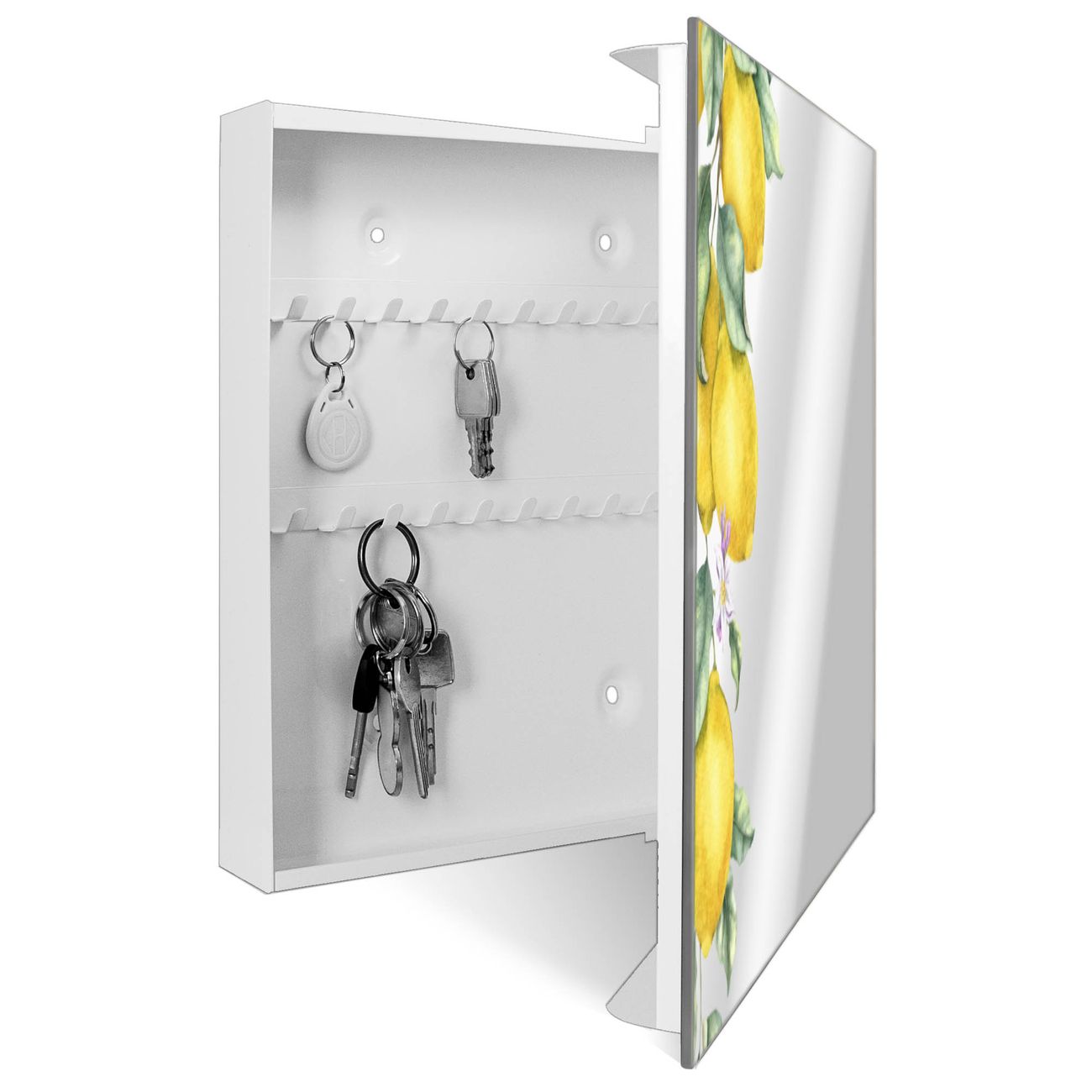 Bringe Ordnung und Stil in deinen Eingangsbereich mit dem banjado Schlüsselkasten mit Spiegel. Die elegante Spiegelfront kombiniert Funktionalität mit modernem Design und macht die Schlüsselaufbewahrung zu einem dekorativen Highlight. ✅ Spiegel Schlüsselaufbewahrung mit Motiv Motiv Zitronenzweig Aquarell Der Design-Schlüsselkasten Motiv Motiv Zitronenzweig Aquarell bietet Platz für bis zu 50 Schlüssel, die auf 5 stabilen Reihen mit je 10 Haken übersichtlich verstaut werden. Mit seinen kompakten Maßen von 30 x 30 x 5 cm passt die Schlüsselbox perfekt auch in kleinere Räume. Der weiß lackierte Stahlkorpus mit rechts angeschlagenem Türscharnier harmoniert mit der Spiegelfront und fügt sich nahtlos in jedes Wohnambiente ein. Ob als Schlüsselorganizer für Zuhause oder als praktische Lösung für Büros, Praxen und Gewerbe, der banjado Schlüsselkasten sorgt für Ordnung und Übersicht. Die Spiegelfront verleiht dem Eingangsbereich zusätzliche Funktionalität und lässt Räume optisch größer wirken. Die Schlüsselbox Motiv Motiv Zitronenzweig Aquarell zur Wandmontage wird inklusive Befestigungsmaterial geliefert und ist schnell angebracht. So hast du deine Schlüssel jederzeit griffbereit und zugleich stilvoll verstaut. Mit diesem banjado Schlüsselkasten Motiv Motiv Zitronenzweig Aquarell kombinierst du praktische Aufbewahrung mit stilvollem Wohndesign. Ob privat oder geschäftlich, die Schlüsselbox sorgt für mehr Ordnung, Übersicht und ein wohnliches Ambiente.Vorteile im Überblick