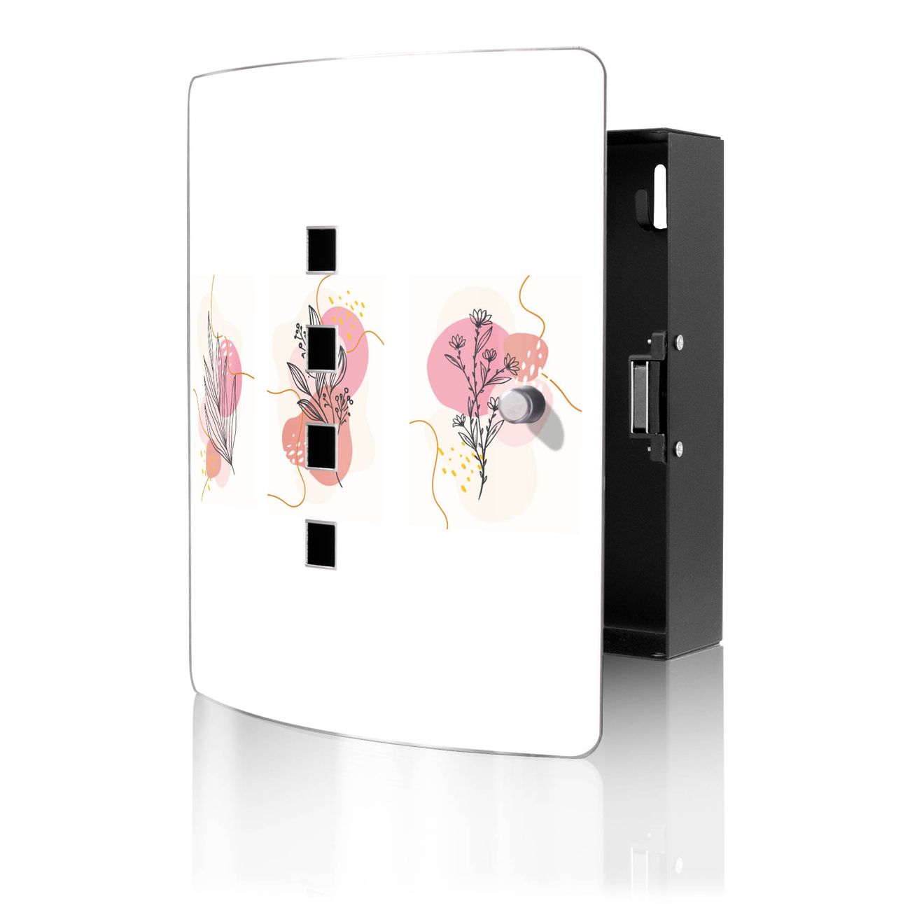 Funktion / Nutzen: Die leicht geschwungene Edelstahltür ist mit einer hochwertigen Motivfolie und dem Motiv Motiv Abstrakte Blumenkomposition kaschiert. Ein praktischer Magnetverschluss ermöglicht Ihnen ein schnelles Öffnen und Schließen. Befestigt wird der Schlüsselkasten an 2 Stellen auf der Rückseite, passendes Montagematerial fügen wir bereits bei.