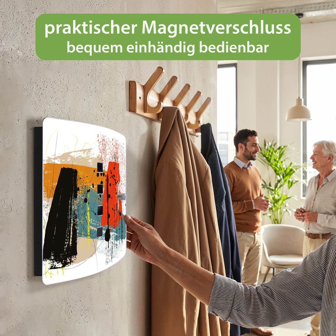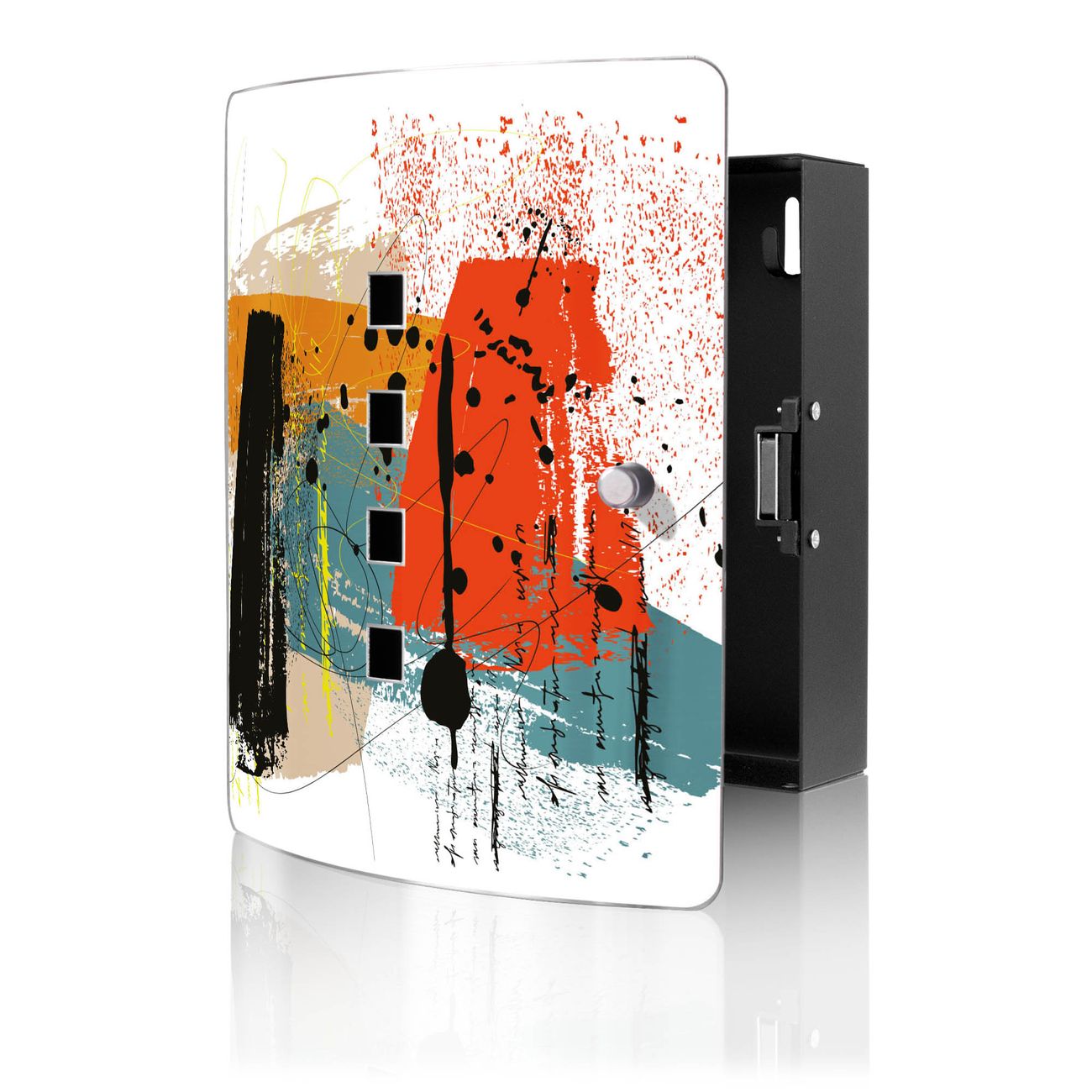 Funktion / Nutzen: Die leicht geschwungene Edelstahltür ist mit einer hochwertigen Motivfolie und dem Motiv Motiv Abstrakte Farbexplosion kaschiert. Ein praktischer Magnetverschluss ermöglicht Ihnen ein schnelles Öffnen und Schließen. Befestigt wird der Schlüsselkasten an 2 Stellen auf der Rückseite, passendes Montagematerial fügen wir bereits bei.