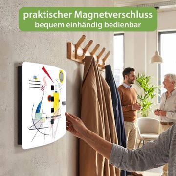Funktion / Nutzen: Die leicht geschwungene Edelstahltür ist mit einer hochwertigen Motivfolie und dem Motiv Motiv Abstrakte Komposition kaschiert. Ein praktischer Magnetverschluss ermöglicht Ihnen ein schnelles Öffnen und Schließen. Befestigt wird der Schlüsselkasten an 2 Stellen auf der Rückseite, passendes Montagematerial fügen wir bereits bei.