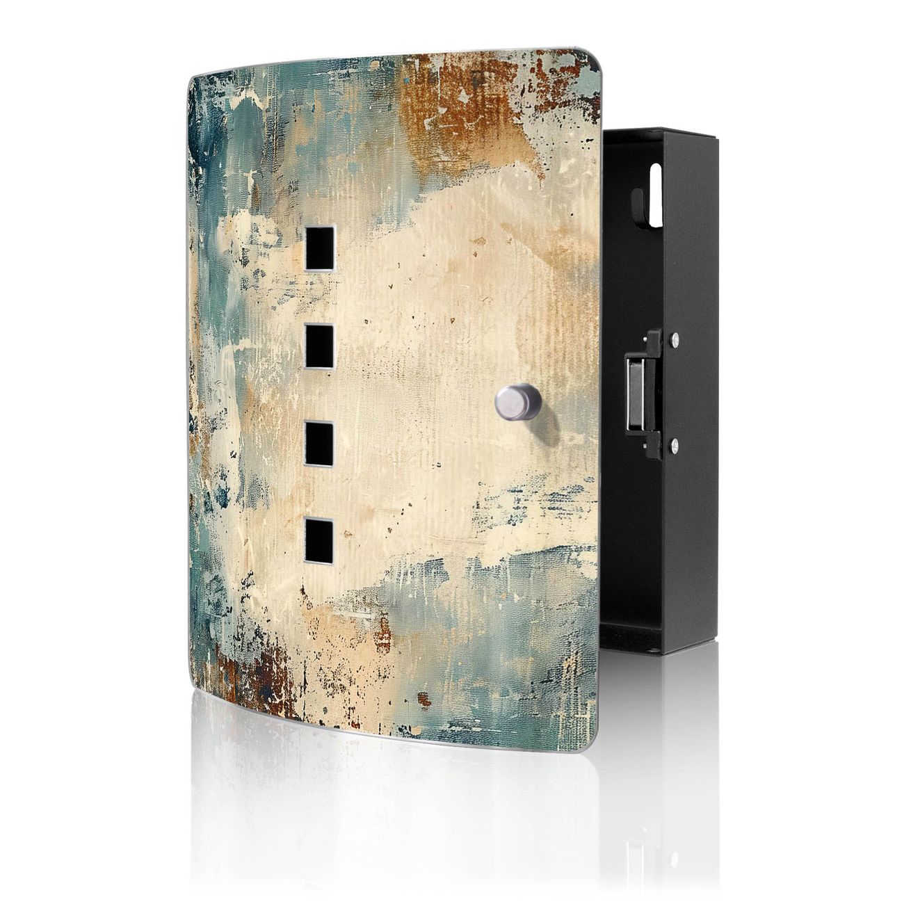 Funktion / Nutzen: Die leicht geschwungene Edelstahltür ist mit einer hochwertigen Motivfolie und dem Motiv Motiv Abstrakte Textur kaschiert. Ein praktischer Magnetverschluss ermöglicht Ihnen ein schnelles Öffnen und Schließen. Befestigt wird der Schlüsselkasten an 2 Stellen auf der Rückseite, passendes Montagematerial fügen wir bereits bei.