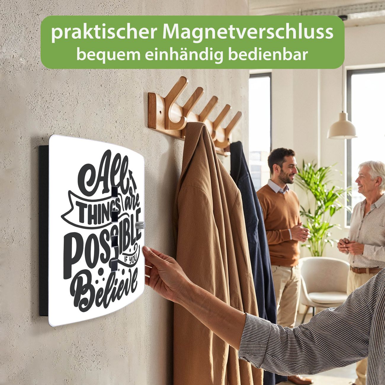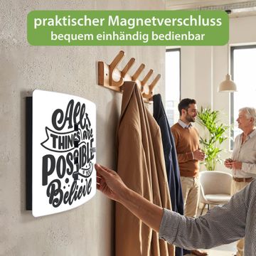 Funktion / Nutzen: Die leicht geschwungene Edelstahltür ist mit einer hochwertigen Motivfolie und dem Motiv Motiv All Things are possible 2 kaschiert. Ein praktischer Magnetverschluss ermöglicht Ihnen ein schnelles Öffnen und Schließen. Befestigt wird der Schlüsselkasten an 2 Stellen auf der Rückseite, passendes Montagematerial fügen wir bereits bei.