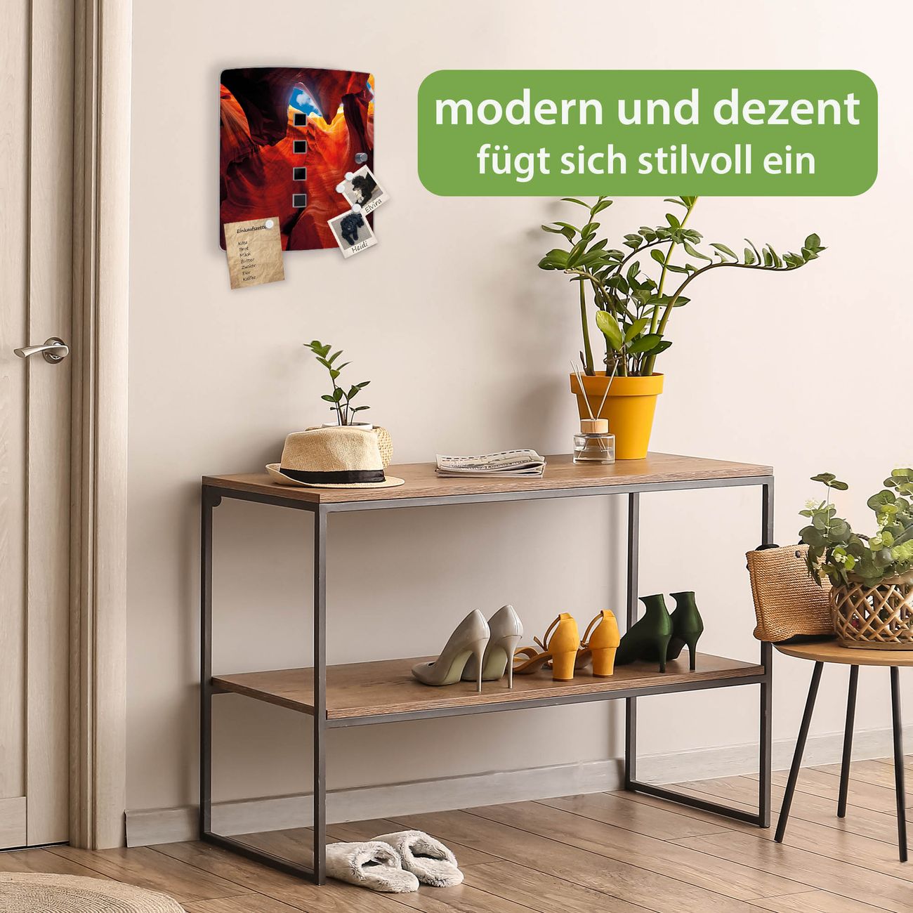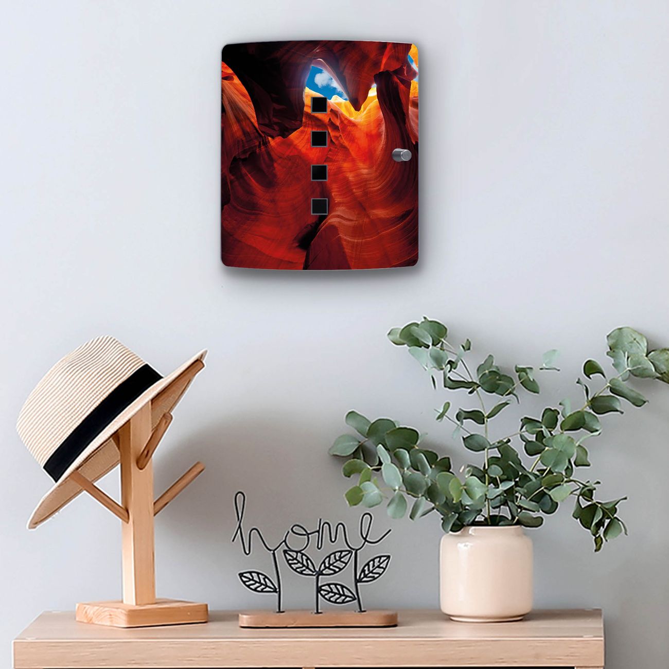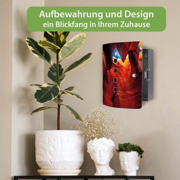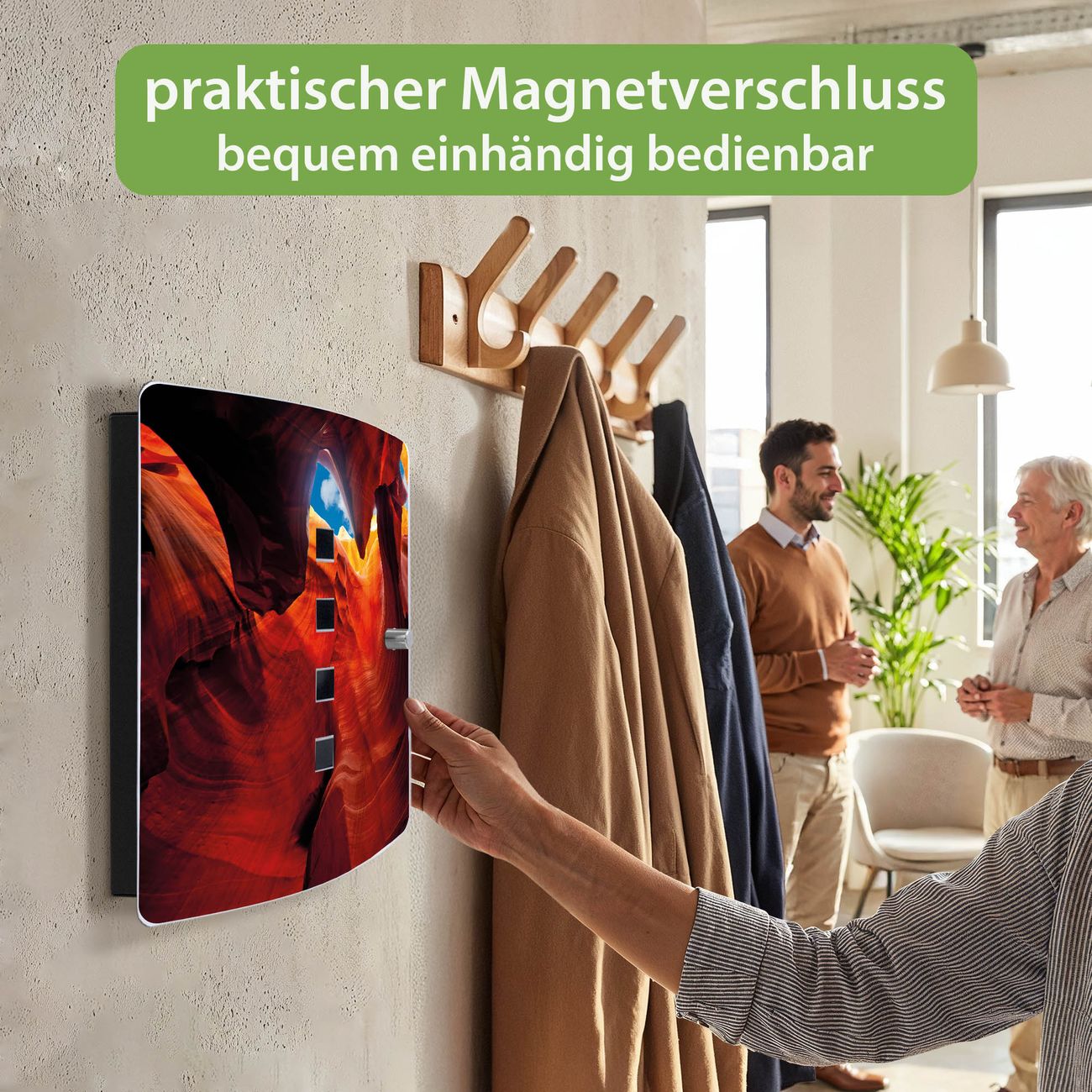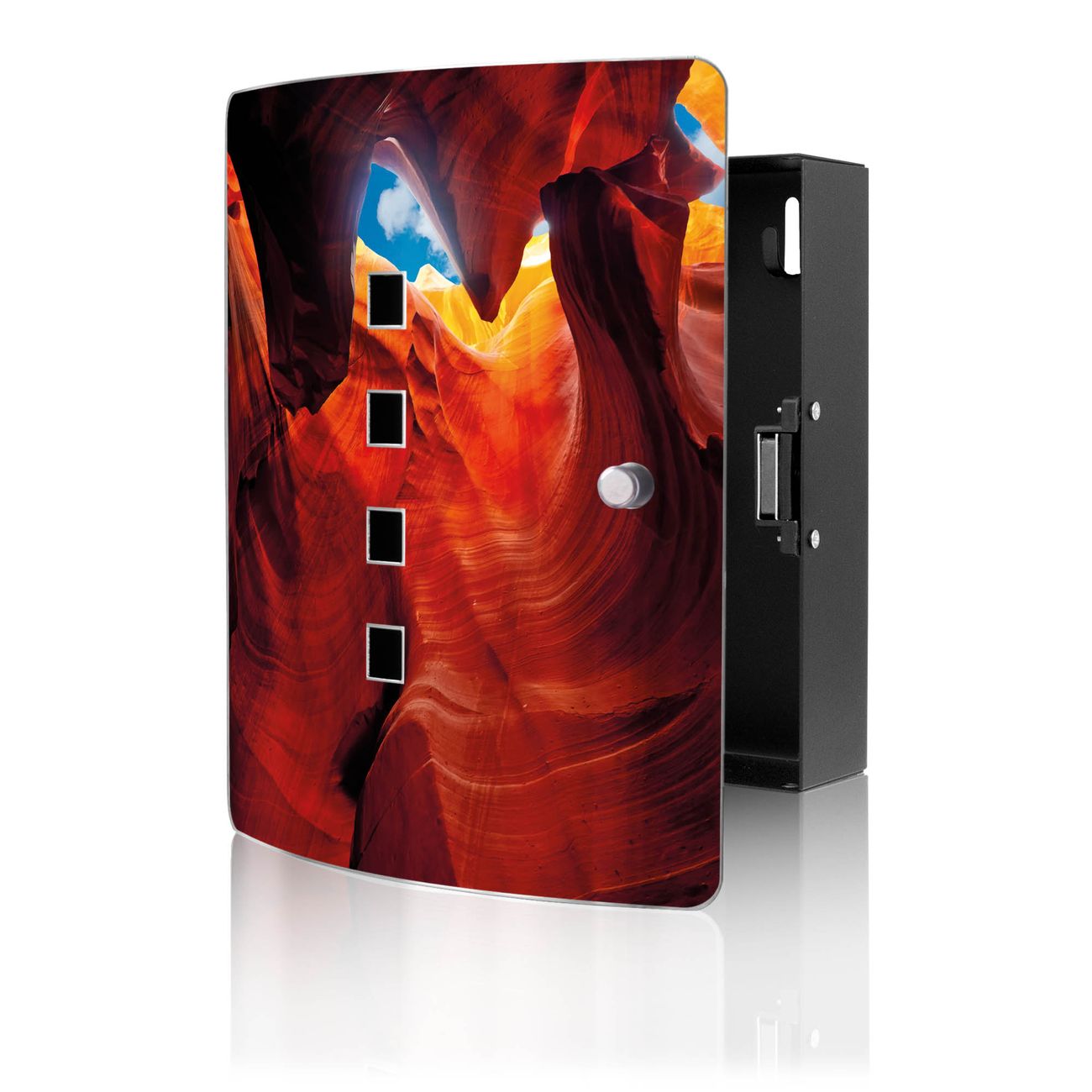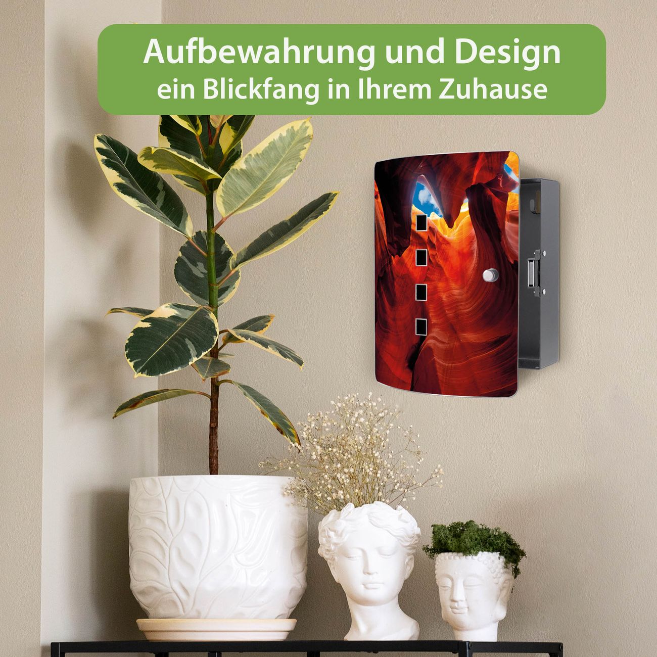 Funktion / Nutzen: Die leicht geschwungene Edelstahltür ist mit einer hochwertigen Motivfolie und dem Motiv Motiv Antelope Canyon 2 kaschiert. Ein praktischer Magnetverschluss ermöglicht Ihnen ein schnelles Öffnen und Schließen. Befestigt wird der Schlüsselkasten an 2 Stellen auf der Rückseite, passendes Montagematerial fügen wir bereits bei.
