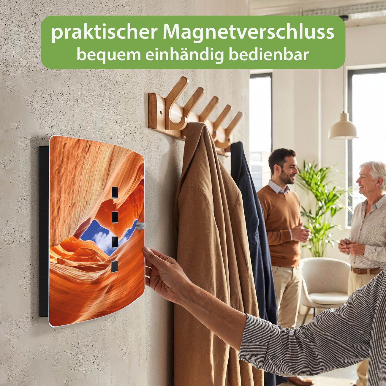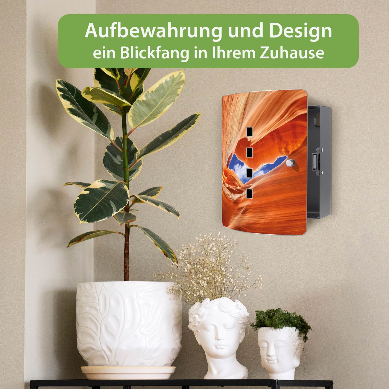 Funktion / Nutzen: Die leicht geschwungene Edelstahltür ist mit einer hochwertigen Motivfolie und dem Motiv Motiv Antelope Canyon 3 kaschiert. Ein praktischer Magnetverschluss ermöglicht Ihnen ein schnelles Öffnen und Schließen. Befestigt wird der Schlüsselkasten an 2 Stellen auf der Rückseite, passendes Montagematerial fügen wir bereits bei.