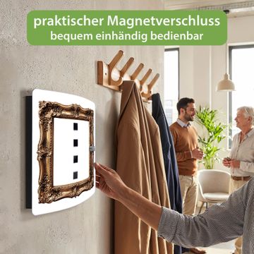 Funktion / Nutzen: Die leicht geschwungene Edelstahltür ist mit einer hochwertigen Motivfolie und dem Motiv Motiv Antiker Bilderrahmen 2 kaschiert. Ein praktischer Magnetverschluss ermöglicht Ihnen ein schnelles Öffnen und Schließen. Befestigt wird der Schlüsselkasten an 2 Stellen auf der Rückseite, passendes Montagematerial fügen wir bereits bei.