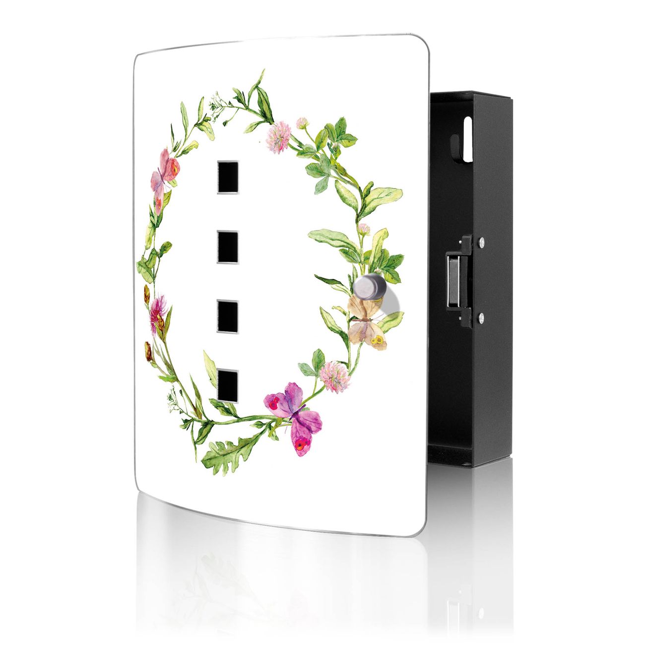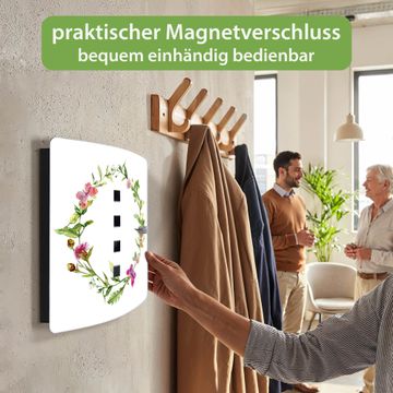 Funktion / Nutzen: Die leicht geschwungene Edelstahltür ist mit einer hochwertigen Motivfolie und dem Motiv Motiv Aquarell Blumenring kaschiert. Ein praktischer Magnetverschluss ermöglicht Ihnen ein schnelles Öffnen und Schließen. Befestigt wird der Schlüsselkasten an 2 Stellen auf der Rückseite, passendes Montagematerial fügen wir bereits bei.