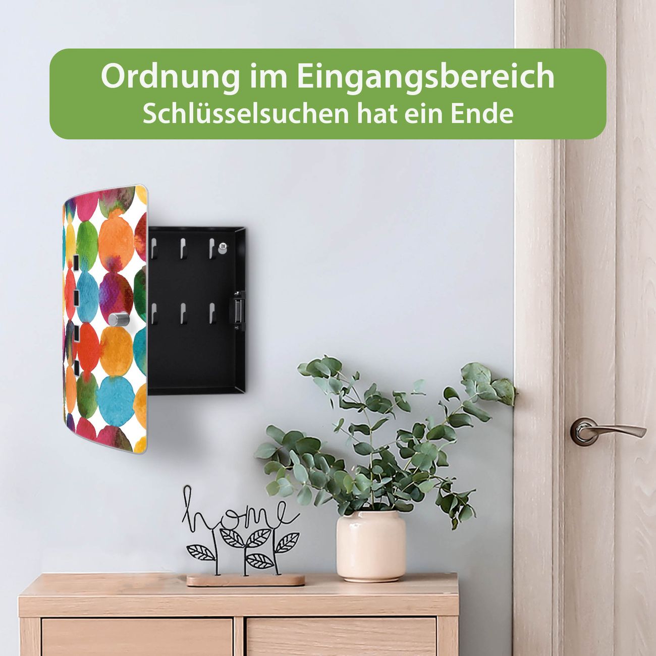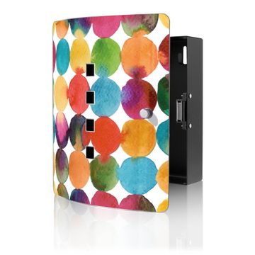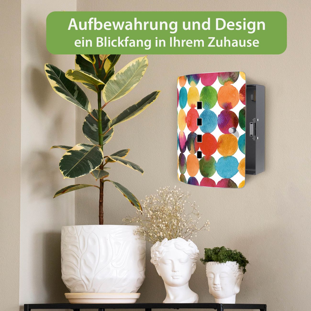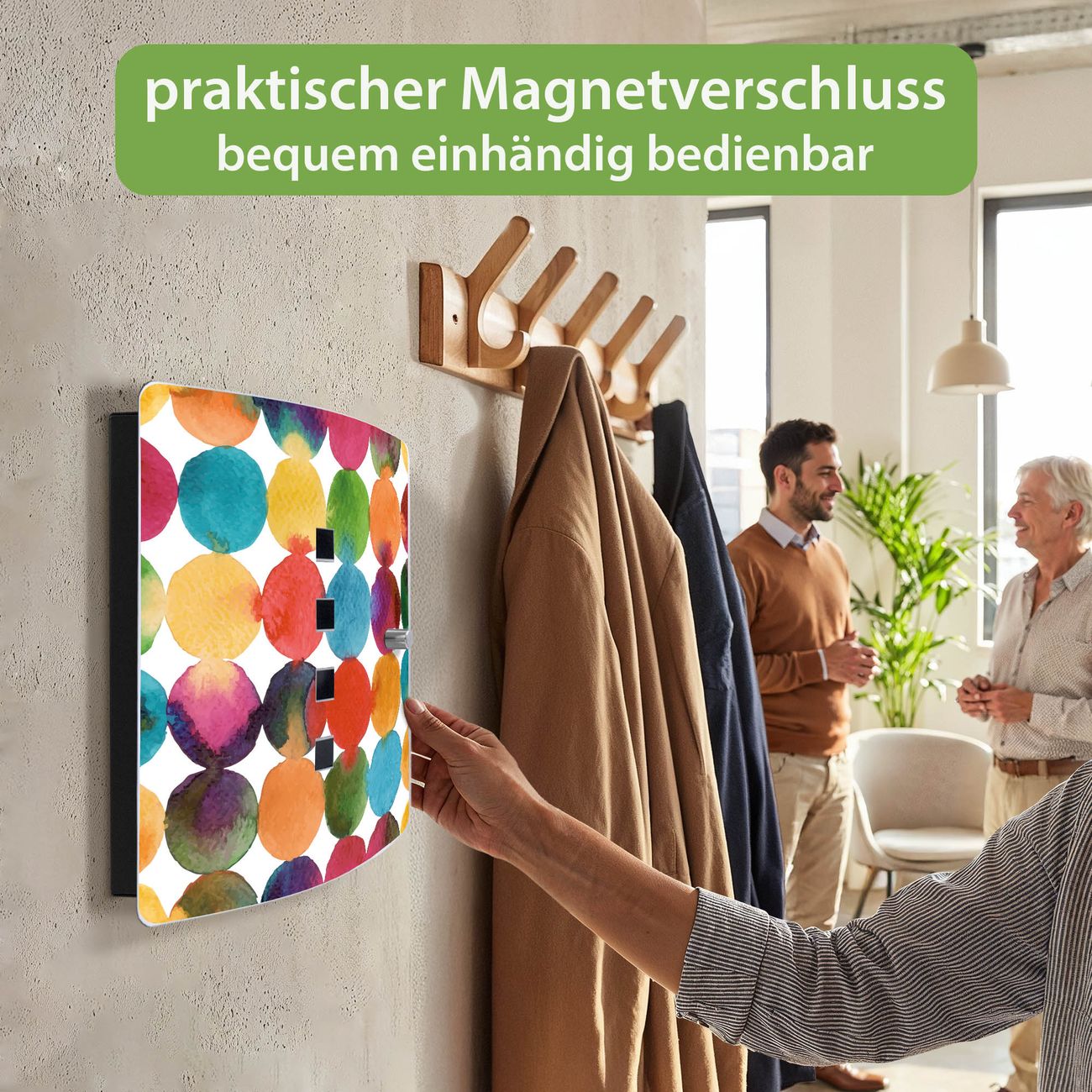 Funktion / Nutzen: Die leicht geschwungene Edelstahltür ist mit einer hochwertigen Motivfolie und dem Motiv Motiv Aquarell Kreise kaschiert. Ein praktischer Magnetverschluss ermöglicht Ihnen ein schnelles Öffnen und Schließen. Befestigt wird der Schlüsselkasten an 2 Stellen auf der Rückseite, passendes Montagematerial fügen wir bereits bei.