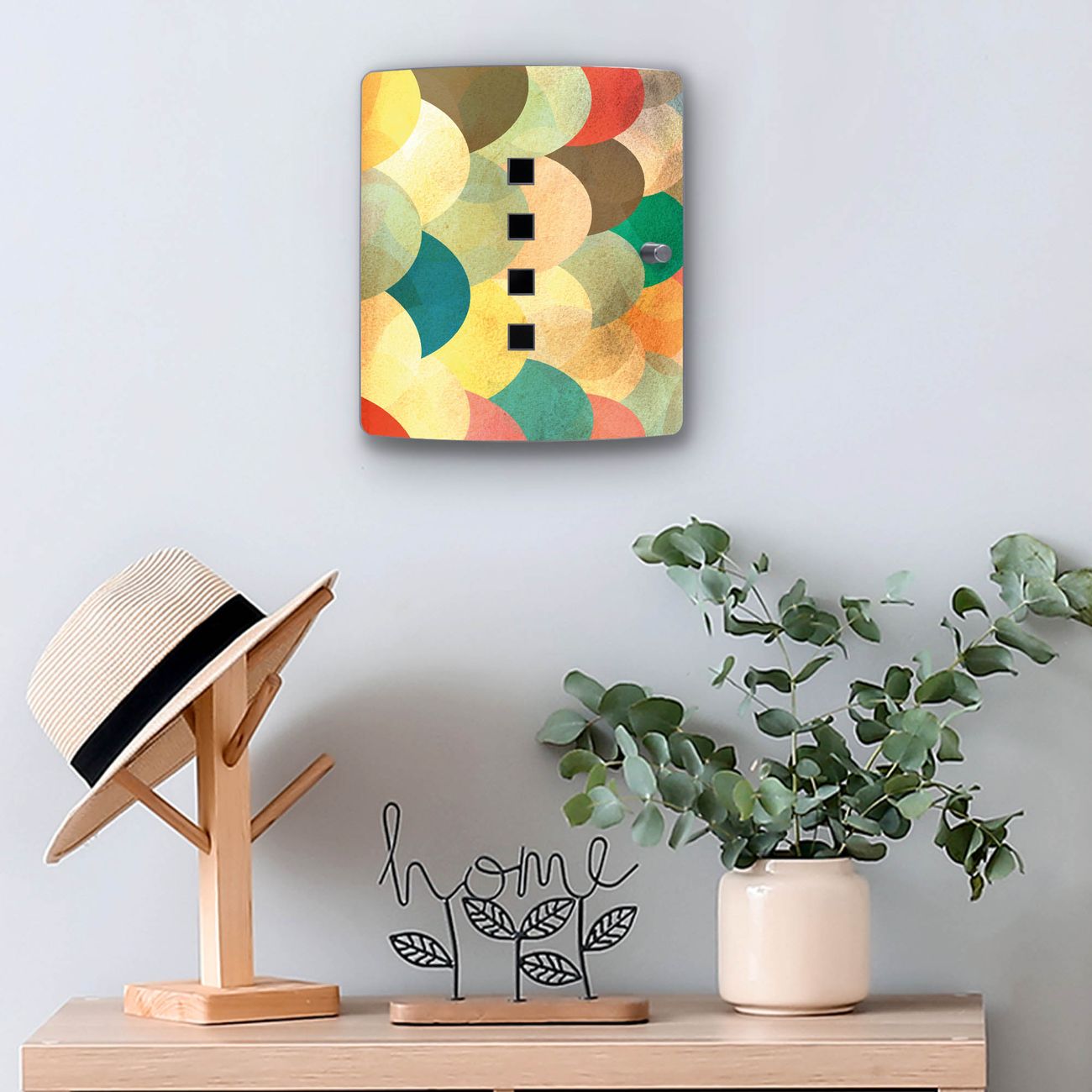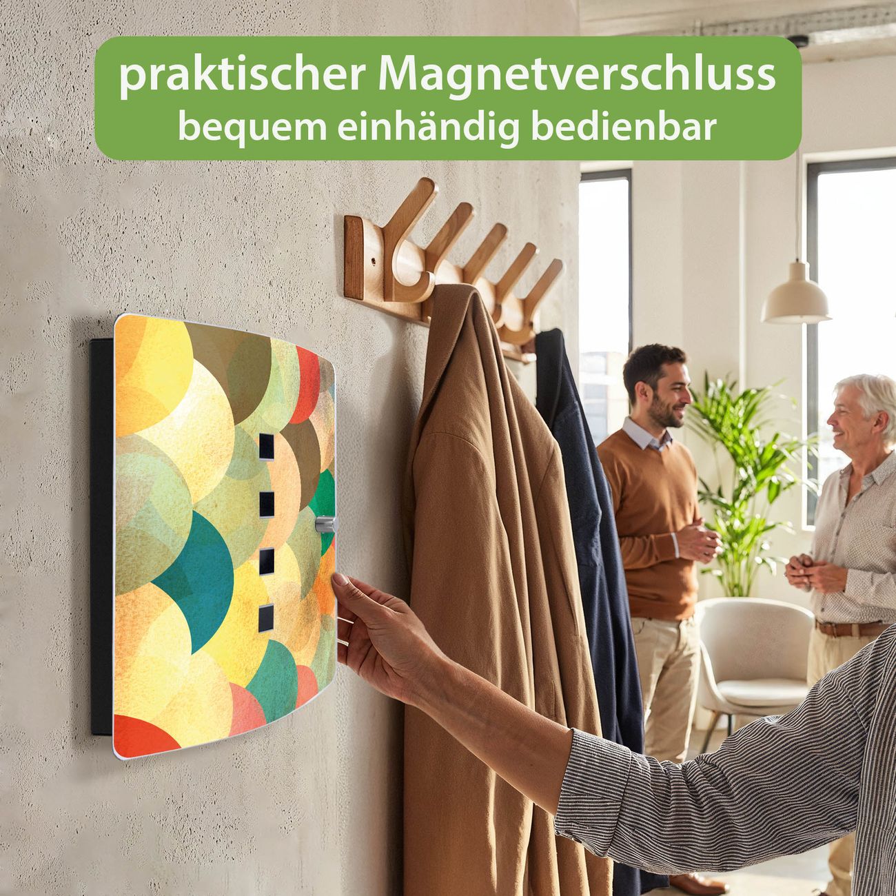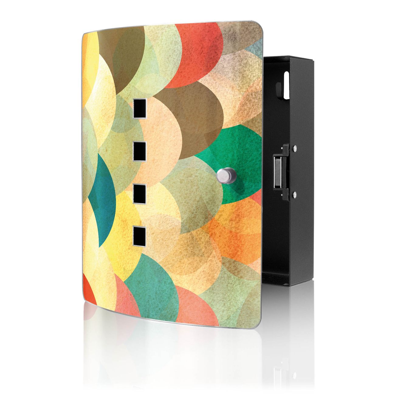 Funktion / Nutzen: Die leicht geschwungene Edelstahltür ist mit einer hochwertigen Motivfolie und dem Motiv Motiv Aquarell Schuppen kaschiert. Ein praktischer Magnetverschluss ermöglicht Ihnen ein schnelles Öffnen und Schließen. Befestigt wird der Schlüsselkasten an 2 Stellen auf der Rückseite, passendes Montagematerial fügen wir bereits bei.