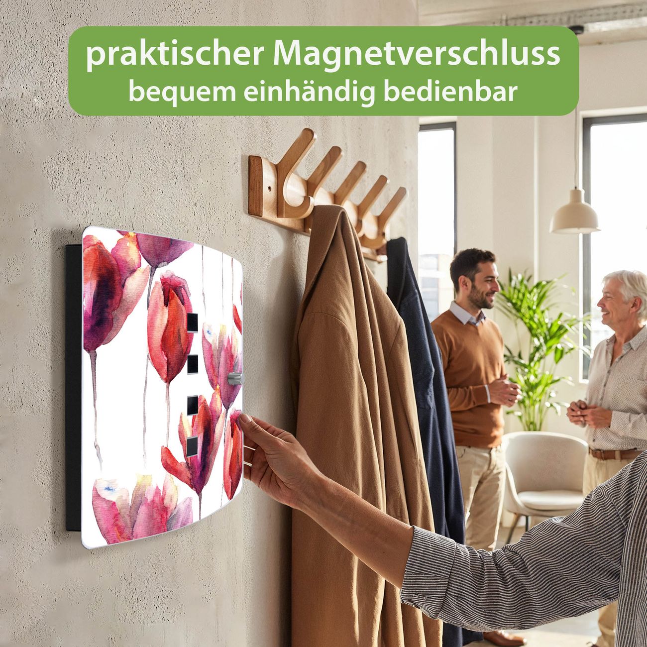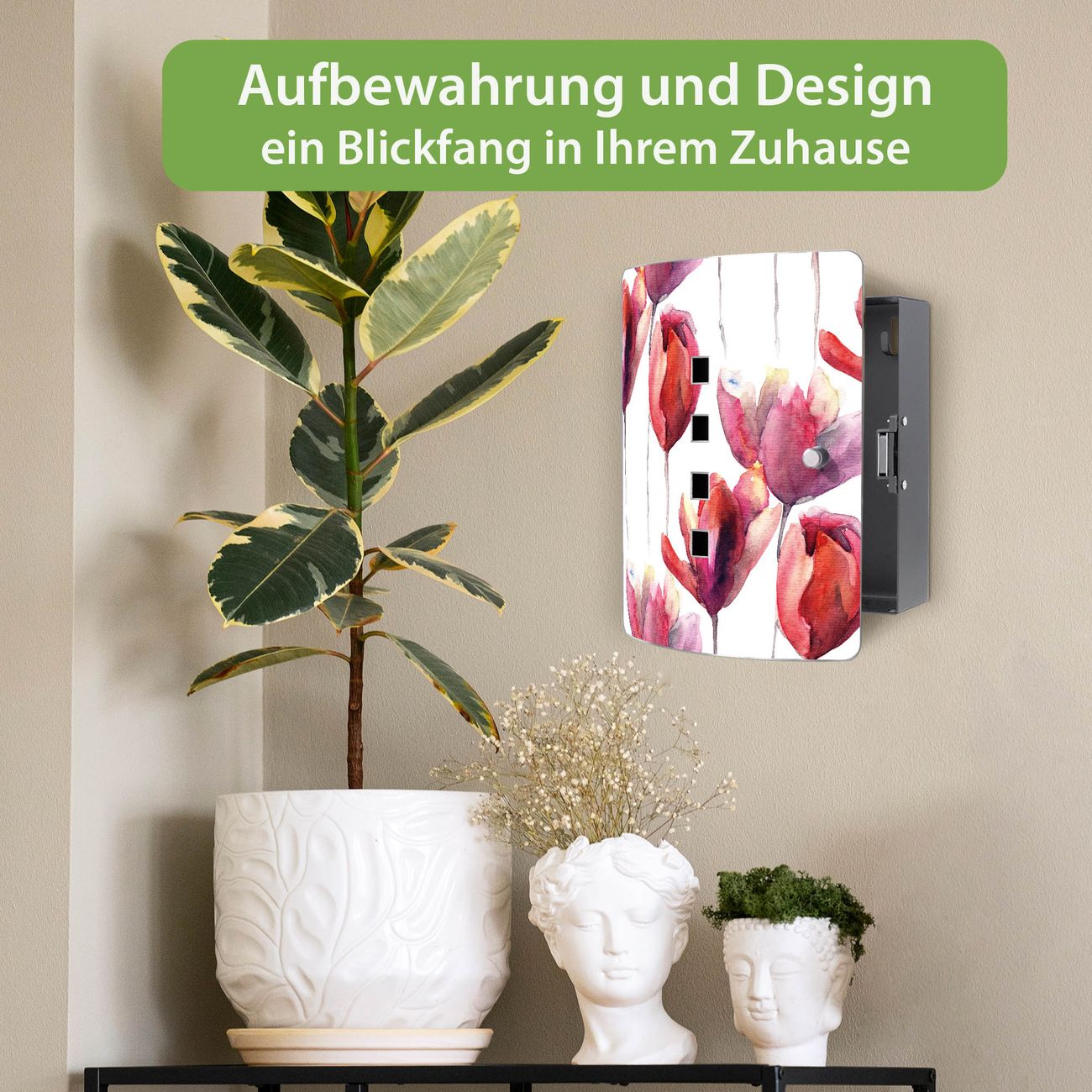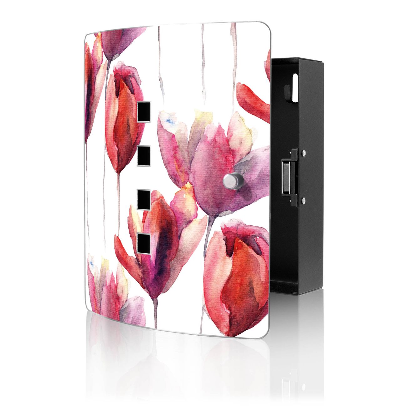 Funktion / Nutzen: Die leicht geschwungene Edelstahltür ist mit einer hochwertigen Motivfolie und dem Motiv Motiv Aquarell Tulpen kaschiert. Ein praktischer Magnetverschluss ermöglicht Ihnen ein schnelles Öffnen und Schließen. Befestigt wird der Schlüsselkasten an 2 Stellen auf der Rückseite, passendes Montagematerial fügen wir bereits bei.