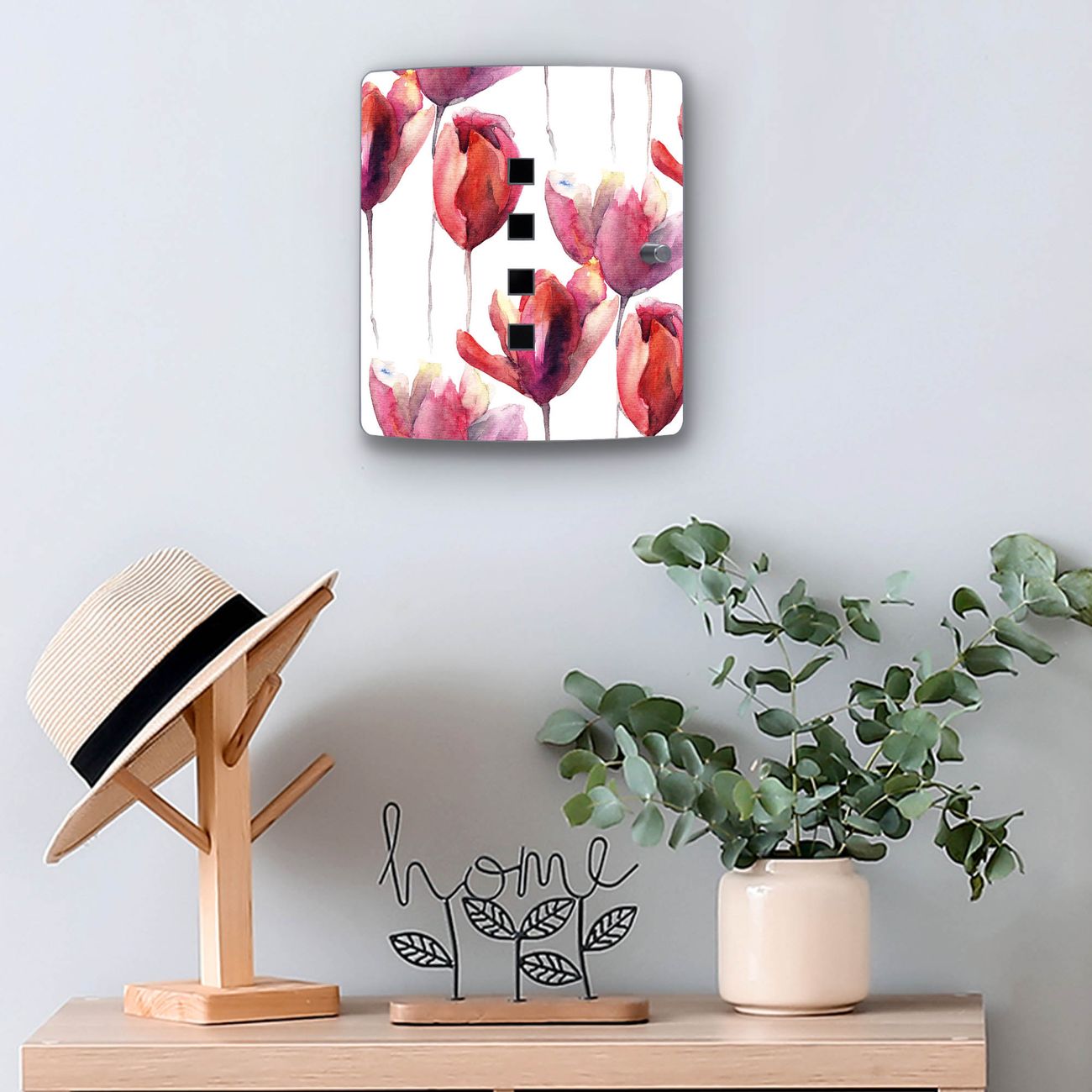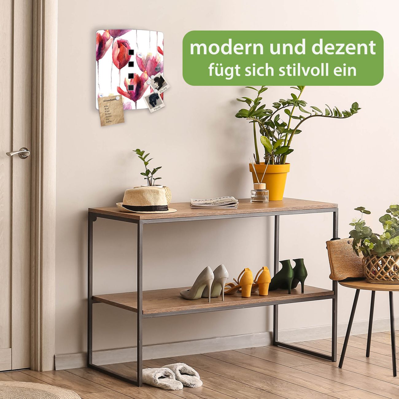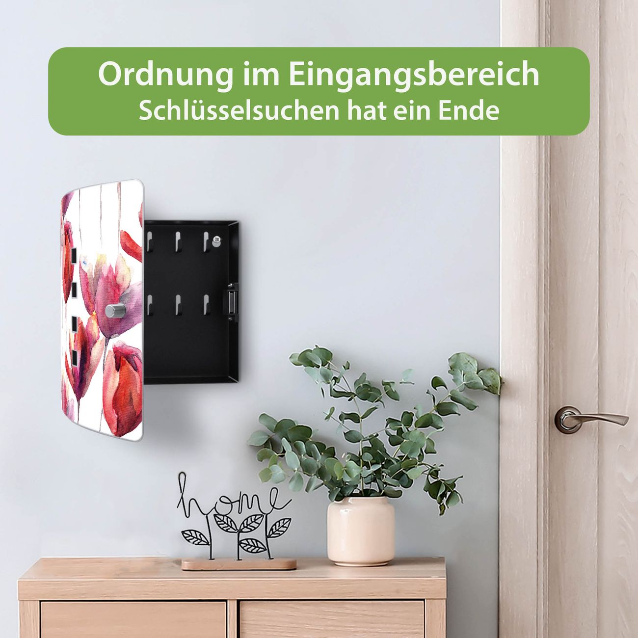 Funktion / Nutzen: Die leicht geschwungene Edelstahltür ist mit einer hochwertigen Motivfolie und dem Motiv Motiv Aquarell Tulpen kaschiert. Ein praktischer Magnetverschluss ermöglicht Ihnen ein schnelles Öffnen und Schließen. Befestigt wird der Schlüsselkasten an 2 Stellen auf der Rückseite, passendes Montagematerial fügen wir bereits bei.