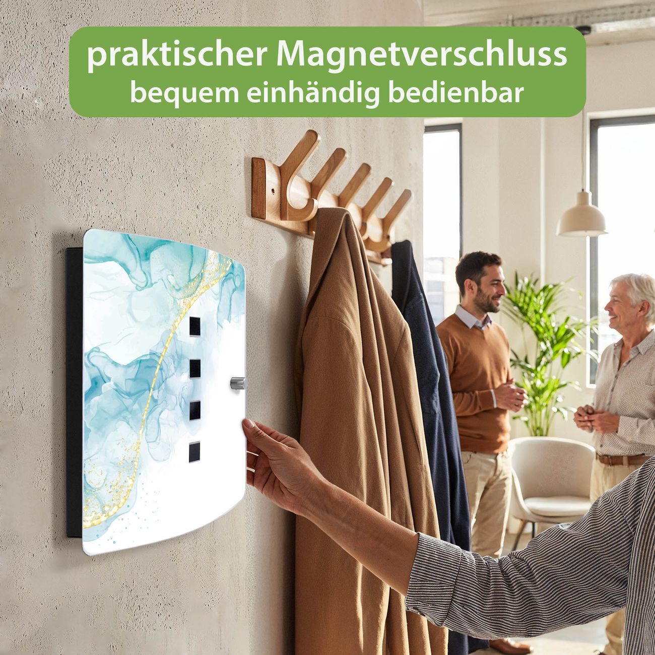 Funktion / Nutzen: Die leicht geschwungene Edelstahltür ist mit einer hochwertigen Motivfolie und dem Motiv Motiv Aquarellfluss kaschiert. Ein praktischer Magnetverschluss ermöglicht Ihnen ein schnelles Öffnen und Schließen. Befestigt wird der Schlüsselkasten an 2 Stellen auf der Rückseite, passendes Montagematerial fügen wir bereits bei.