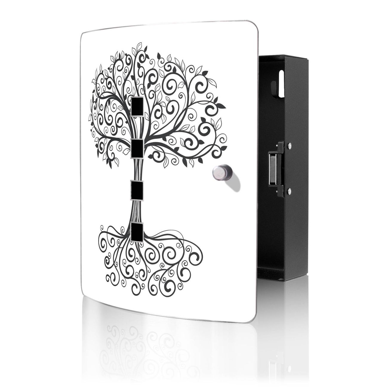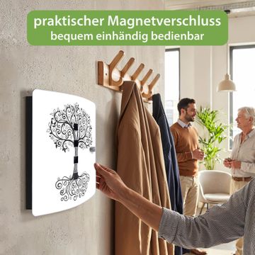 Funktion / Nutzen: Die leicht geschwungene Edelstahltür ist mit einer hochwertigen Motivfolie und dem Motiv Motiv Baum des Lebens kaschiert. Ein praktischer Magnetverschluss ermöglicht Ihnen ein schnelles Öffnen und Schließen. Befestigt wird der Schlüsselkasten an 2 Stellen auf der Rückseite, passendes Montagematerial fügen wir bereits bei.