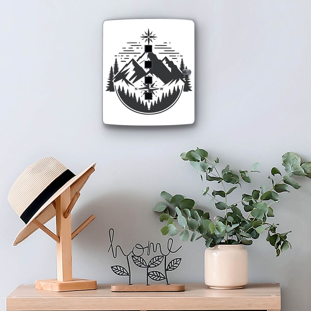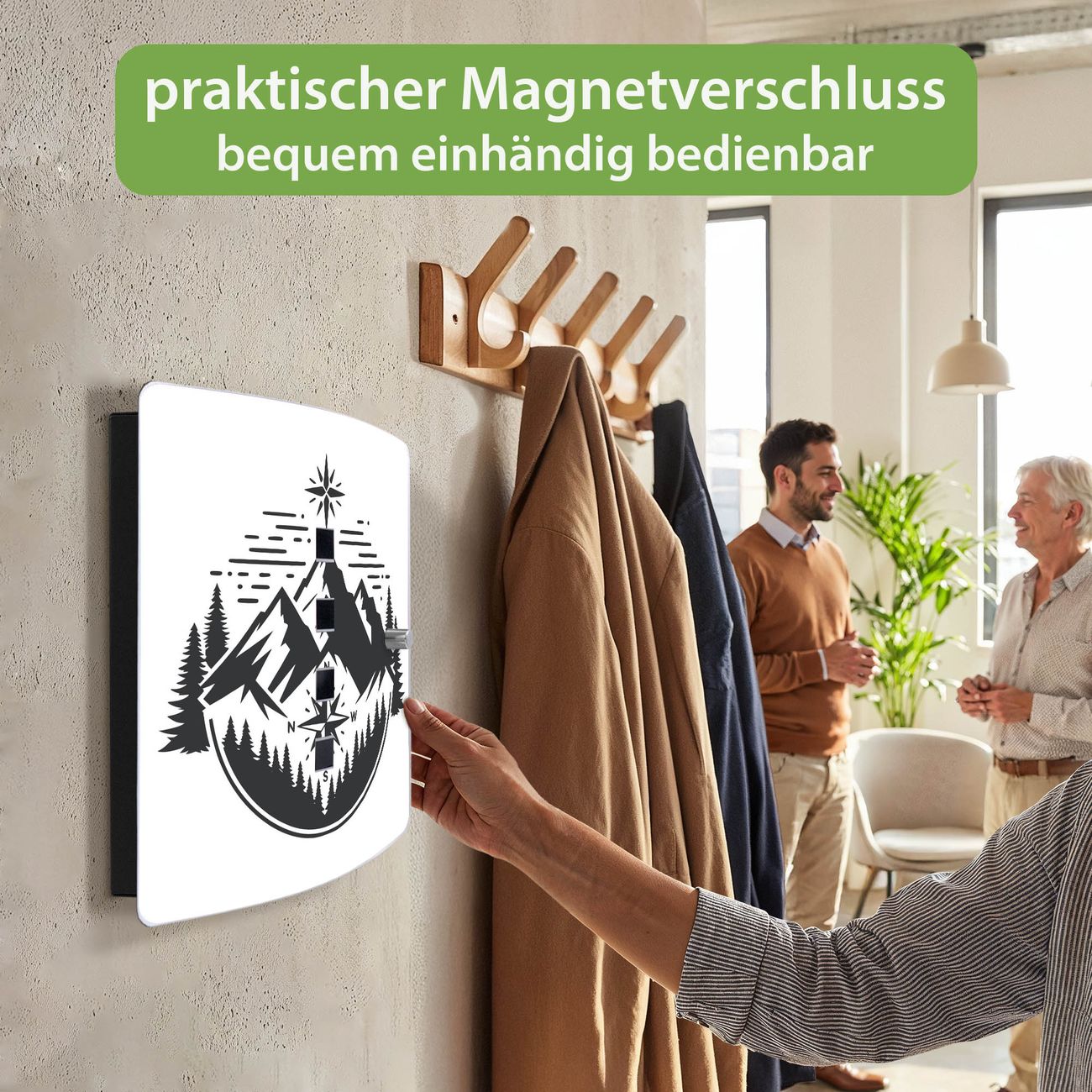 Funktion / Nutzen: Die leicht geschwungene Edelstahltür ist mit einer hochwertigen Motivfolie und dem Motiv Motiv Bergkompass kaschiert. Ein praktischer Magnetverschluss ermöglicht Ihnen ein schnelles Öffnen und Schließen. Befestigt wird der Schlüsselkasten an 2 Stellen auf der Rückseite, passendes Montagematerial fügen wir bereits bei.