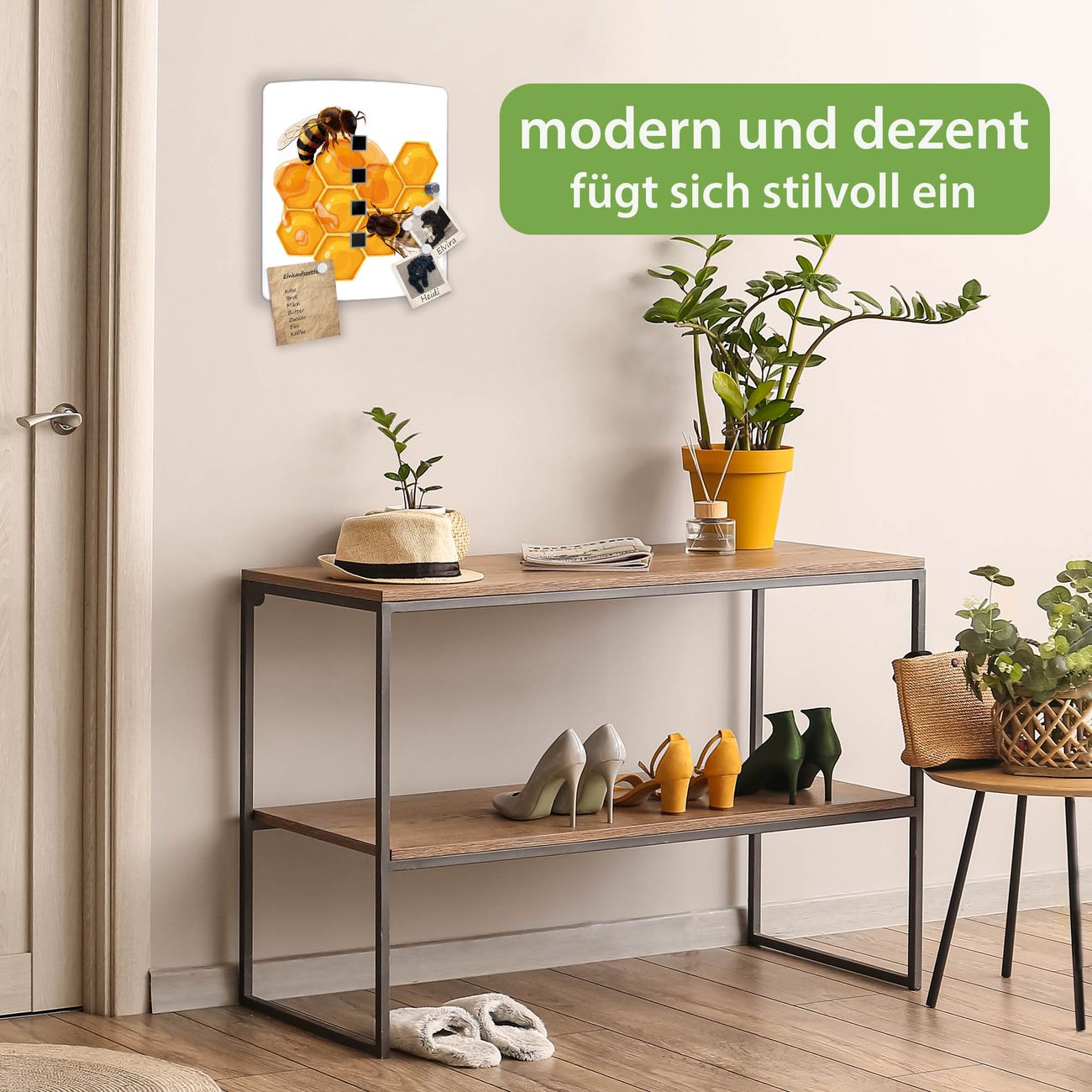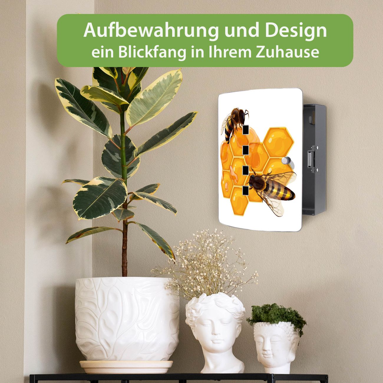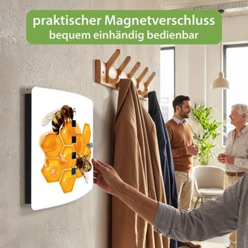 Funktion / Nutzen: Die leicht geschwungene Edelstahltür ist mit einer hochwertigen Motivfolie und dem Motiv Motiv Bienen auf Honigwaben kaschiert. Ein praktischer Magnetverschluss ermöglicht Ihnen ein schnelles Öffnen und Schließen. Befestigt wird der Schlüsselkasten an 2 Stellen auf der Rückseite, passendes Montagematerial fügen wir bereits bei.