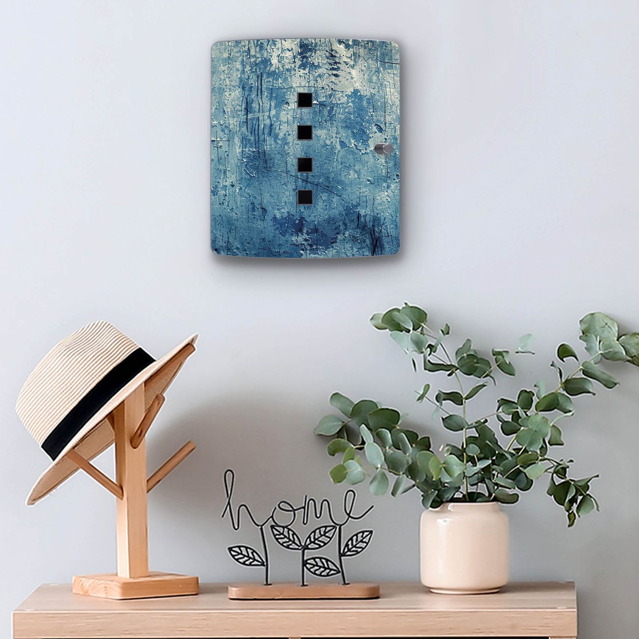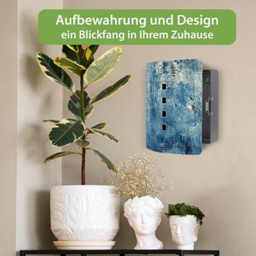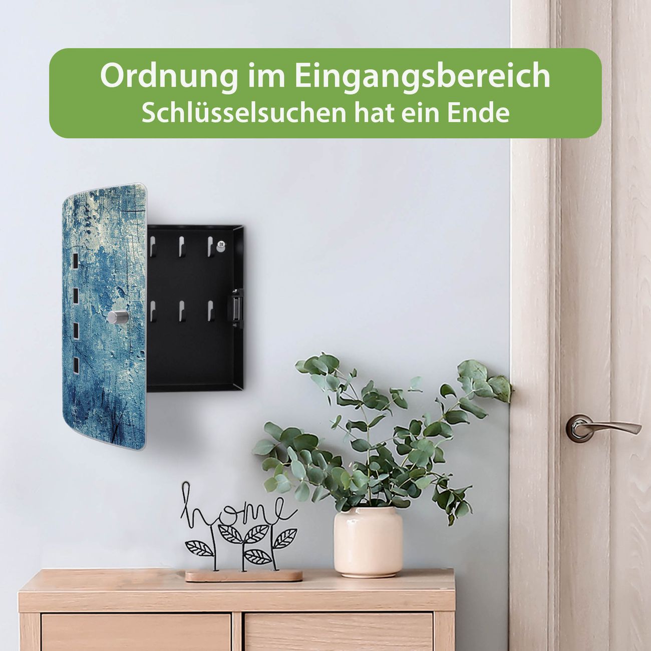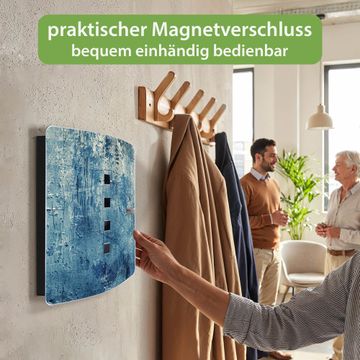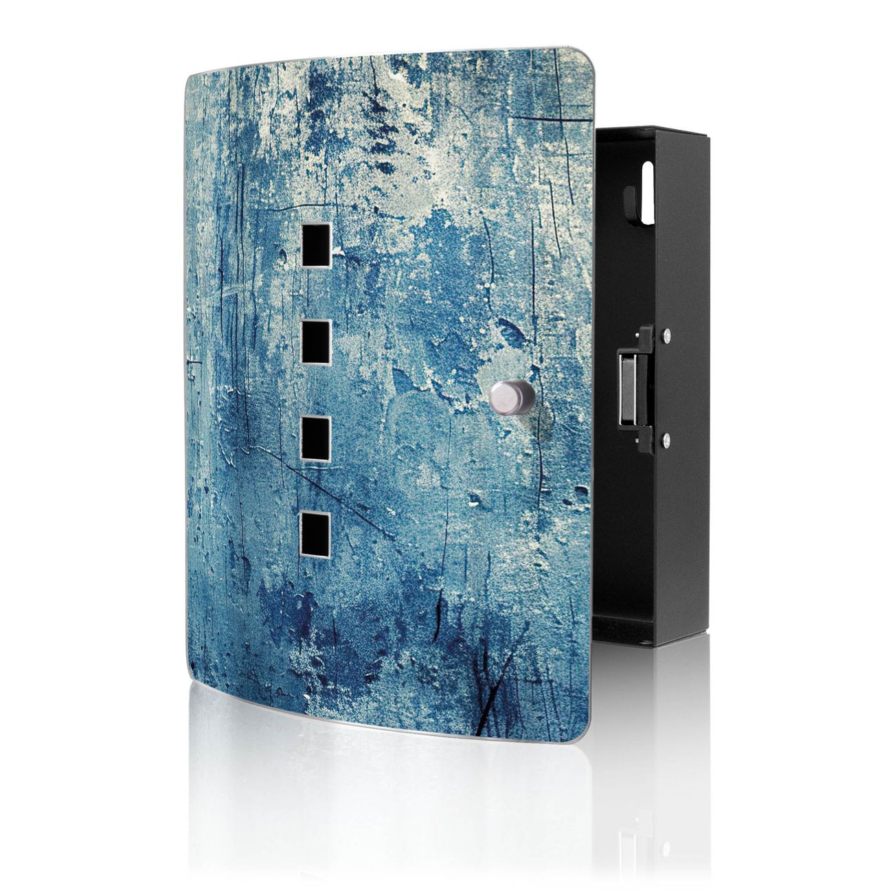 Funktion / Nutzen: Die leicht geschwungene Edelstahltür ist mit einer hochwertigen Motivfolie und dem Motiv Motiv Blaue Wandtextur kaschiert. Ein praktischer Magnetverschluss ermöglicht Ihnen ein schnelles Öffnen und Schließen. Befestigt wird der Schlüsselkasten an 2 Stellen auf der Rückseite, passendes Montagematerial fügen wir bereits bei.