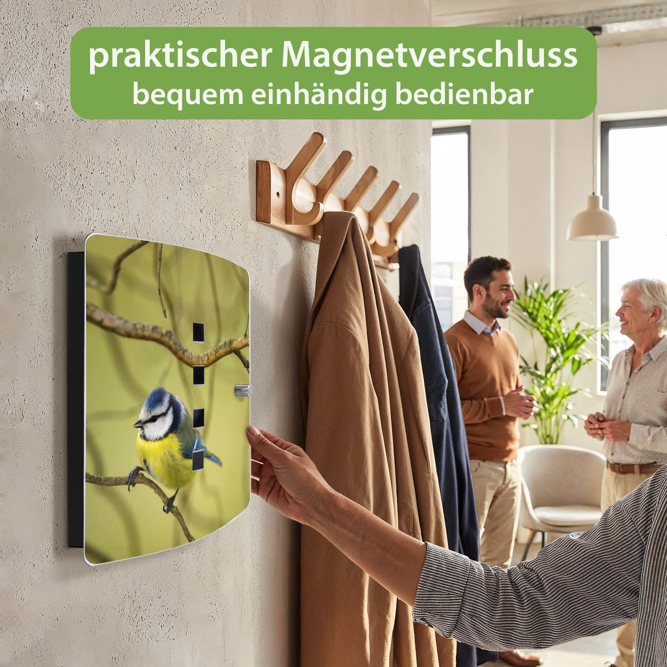 Funktion / Nutzen: Die leicht geschwungene Edelstahltür ist mit einer hochwertigen Motivfolie und dem Motiv Motiv Blaumeise im Baum kaschiert. Ein praktischer Magnetverschluss ermöglicht Ihnen ein schnelles Öffnen und Schließen. Befestigt wird der Schlüsselkasten an 2 Stellen auf der Rückseite, passendes Montagematerial fügen wir bereits bei.