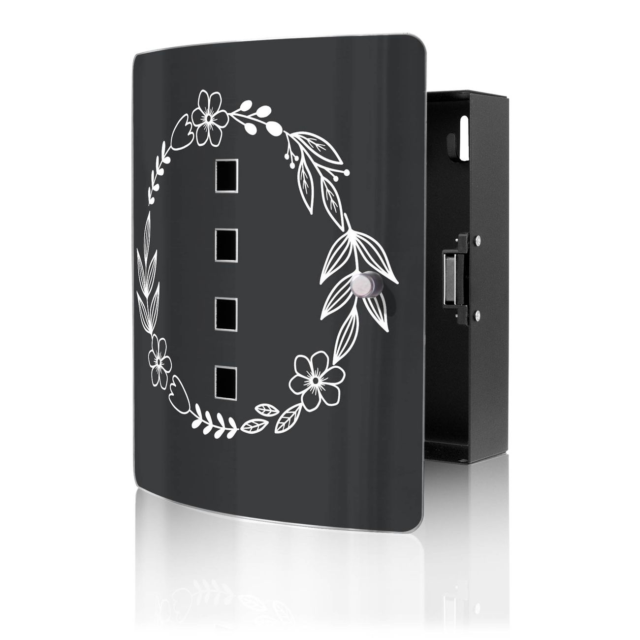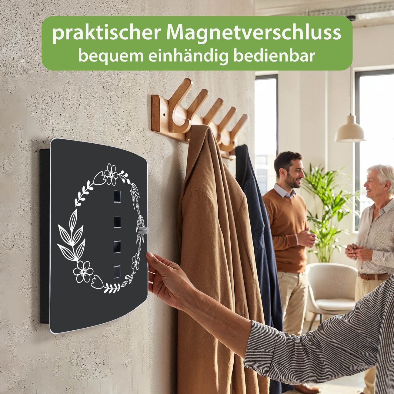 Funktion / Nutzen: Die leicht geschwungene Edelstahltür ist mit einer hochwertigen Motivfolie und dem Motiv Motiv Blütenkranz kaschiert. Ein praktischer Magnetverschluss ermöglicht Ihnen ein schnelles Öffnen und Schließen. Befestigt wird der Schlüsselkasten an 2 Stellen auf der Rückseite, passendes Montagematerial fügen wir bereits bei.
