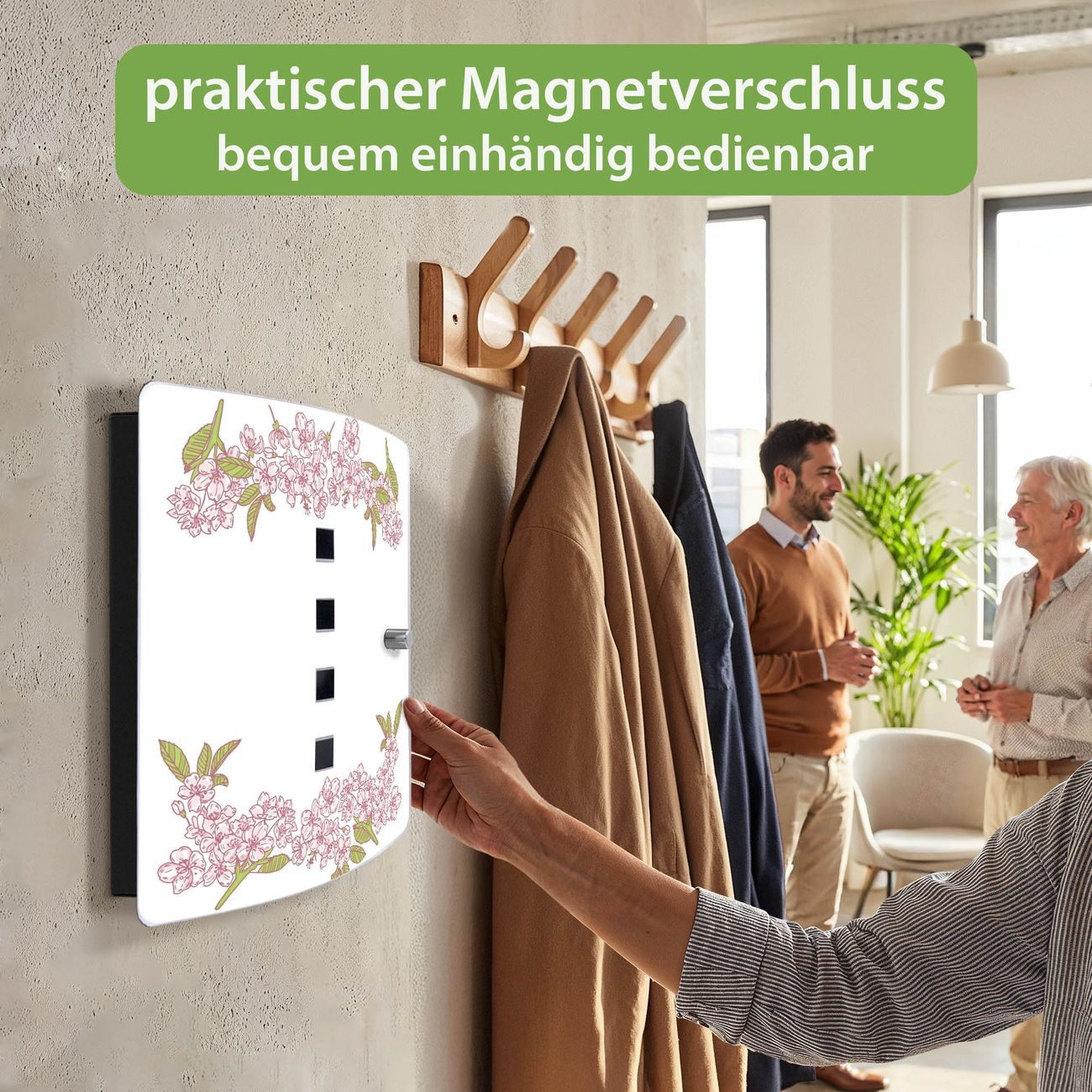Funktion / Nutzen: Die leicht geschwungene Edelstahltür ist mit einer hochwertigen Motivfolie und dem Motiv Motiv Blütenzauber 2 kaschiert. Ein praktischer Magnetverschluss ermöglicht Ihnen ein schnelles Öffnen und Schließen. Befestigt wird der Schlüsselkasten an 2 Stellen auf der Rückseite, passendes Montagematerial fügen wir bereits bei.