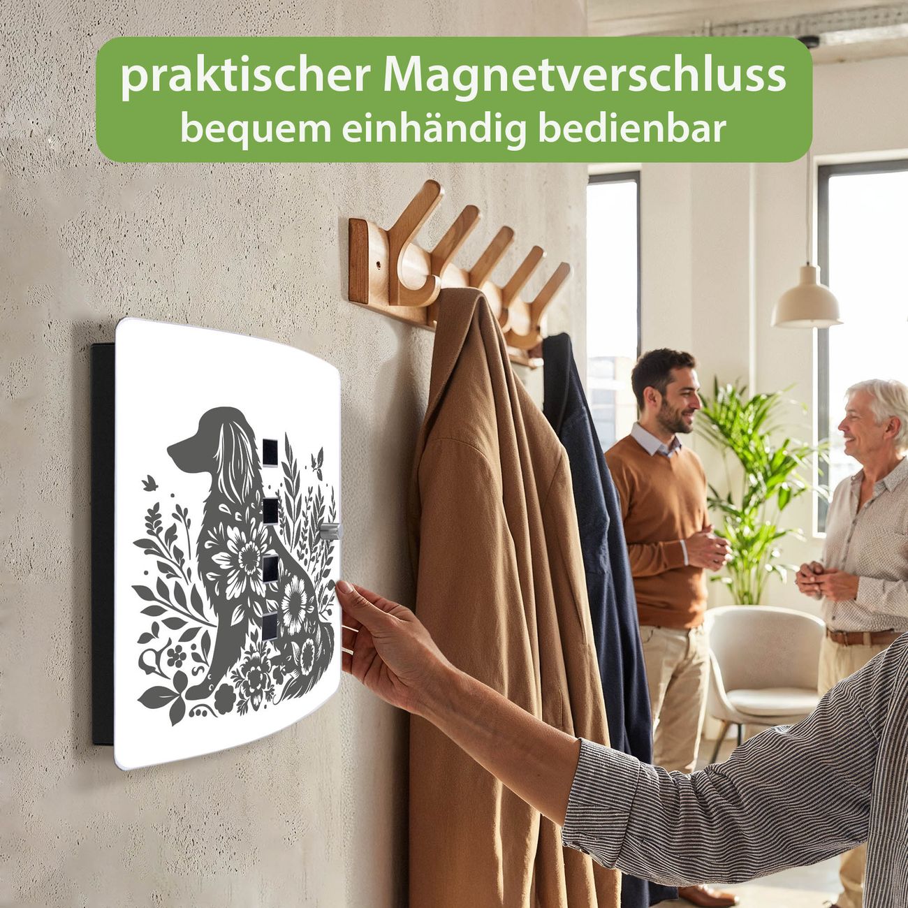 Funktion / Nutzen: Die leicht geschwungene Edelstahltür ist mit einer hochwertigen Motivfolie und dem Motiv Motiv Blumenhund Silhouette kaschiert. Ein praktischer Magnetverschluss ermöglicht Ihnen ein schnelles Öffnen und Schließen. Befestigt wird der Schlüsselkasten an 2 Stellen auf der Rückseite, passendes Montagematerial fügen wir bereits bei.