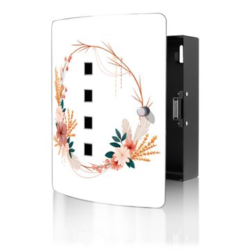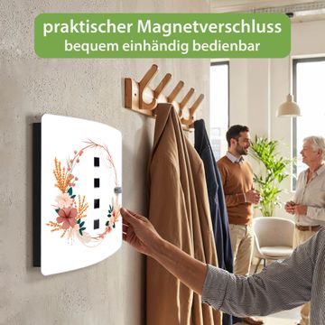 Funktion / Nutzen: Die leicht geschwungene Edelstahltür ist mit einer hochwertigen Motivfolie und dem Motiv Motiv Blumiger Kranz kaschiert. Ein praktischer Magnetverschluss ermöglicht Ihnen ein schnelles Öffnen und Schließen. Befestigt wird der Schlüsselkasten an 2 Stellen auf der Rückseite, passendes Montagematerial fügen wir bereits bei.