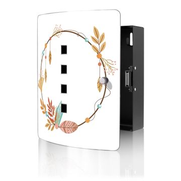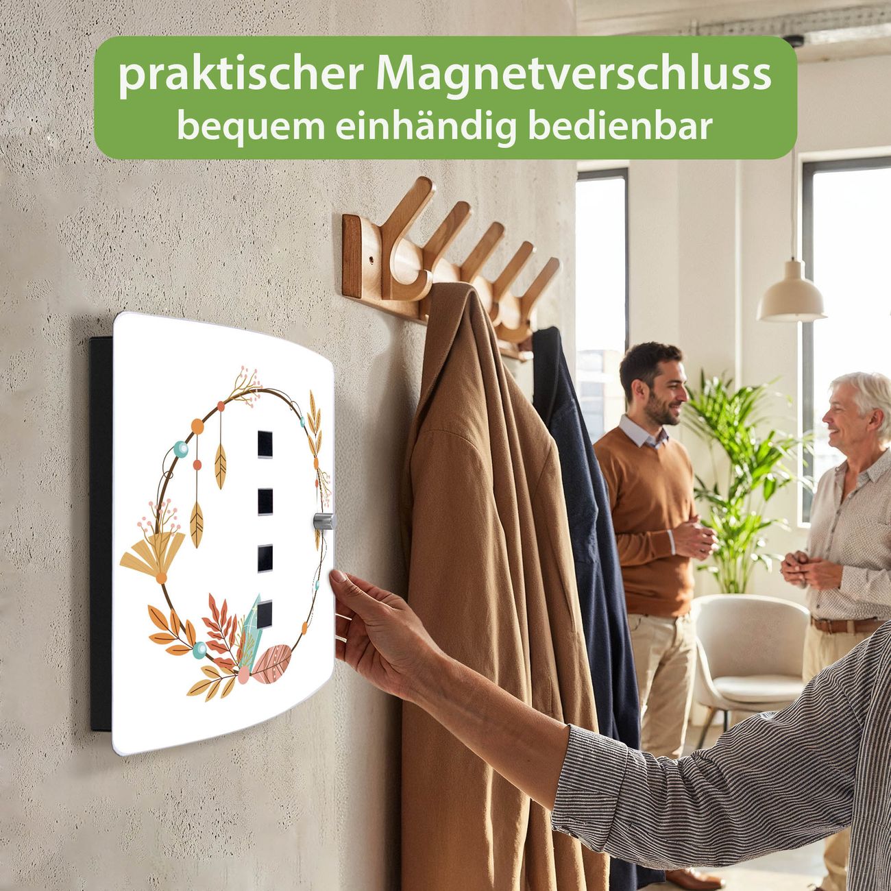 Funktion / Nutzen: Die leicht geschwungene Edelstahltür ist mit einer hochwertigen Motivfolie und dem Motiv Motiv Boho Herbstkranz kaschiert. Ein praktischer Magnetverschluss ermöglicht Ihnen ein schnelles Öffnen und Schließen. Befestigt wird der Schlüsselkasten an 2 Stellen auf der Rückseite, passendes Montagematerial fügen wir bereits bei.