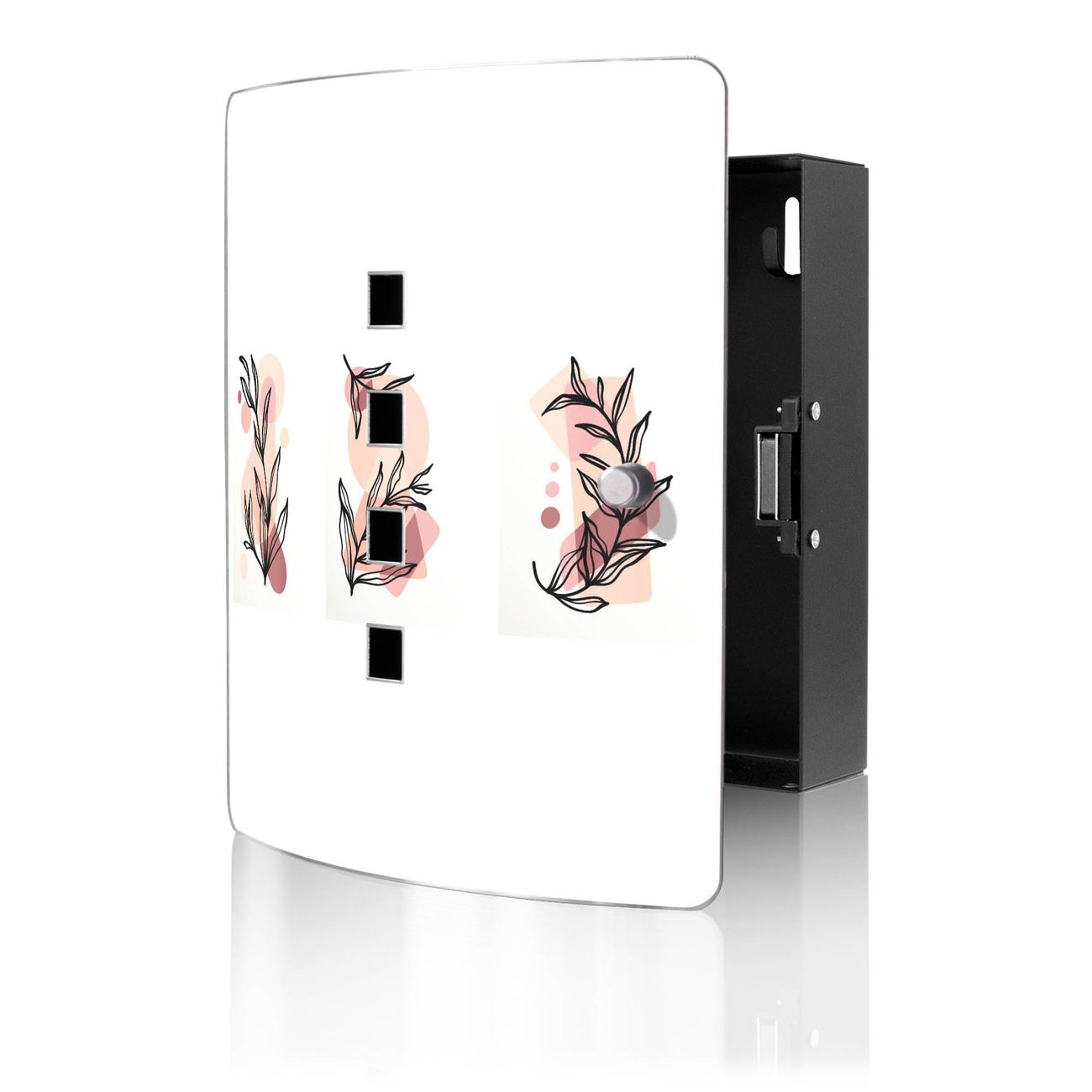 Funktion / Nutzen: Die leicht geschwungene Edelstahltür ist mit einer hochwertigen Motivfolie und dem Motiv Motiv Botanische Linienkunst 2 kaschiert. Ein praktischer Magnetverschluss ermöglicht Ihnen ein schnelles Öffnen und Schließen. Befestigt wird der Schlüsselkasten an 2 Stellen auf der Rückseite, passendes Montagematerial fügen wir bereits bei.