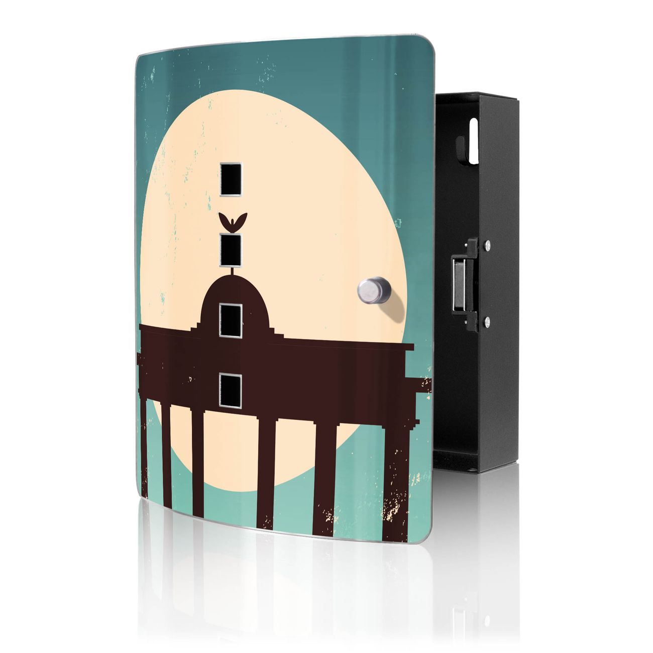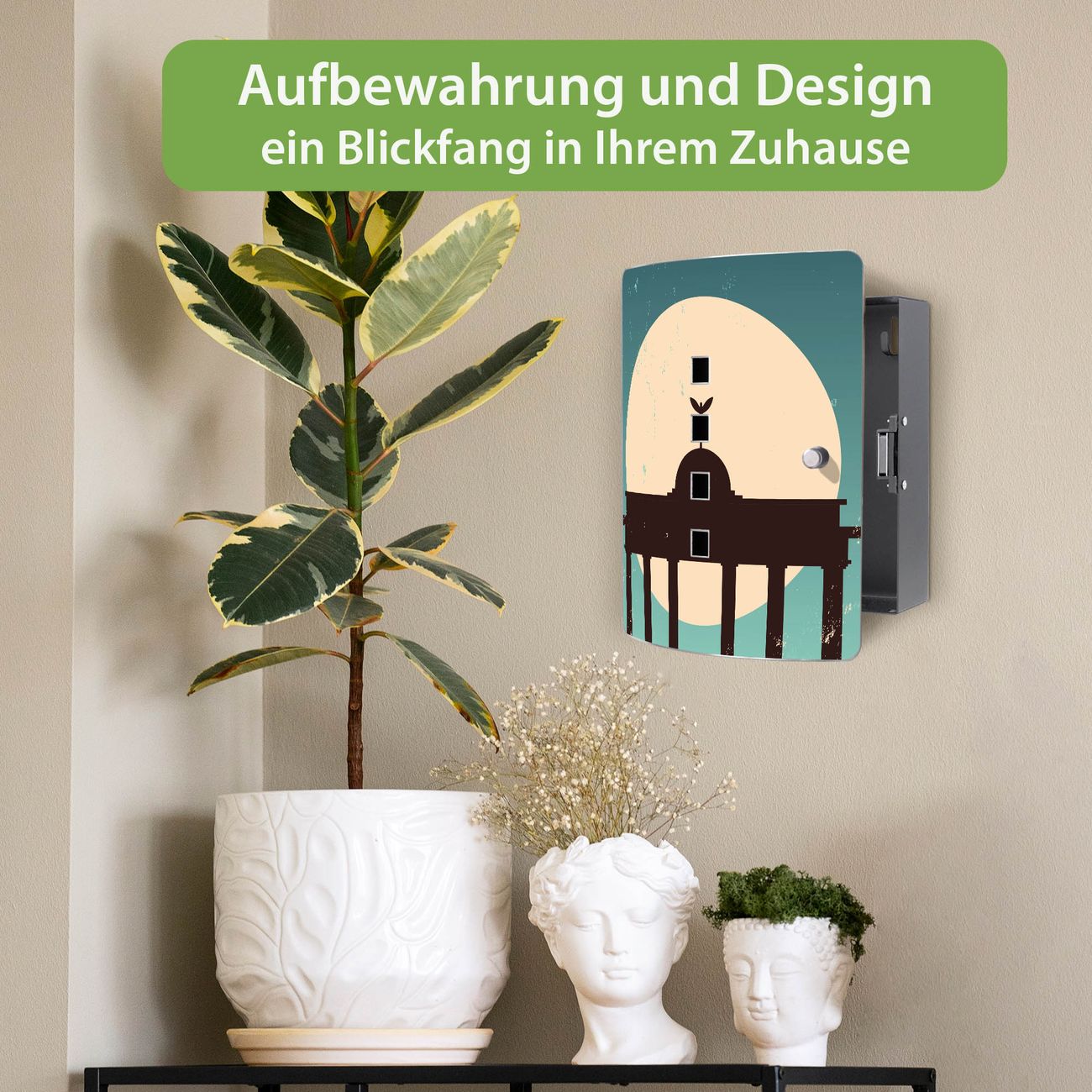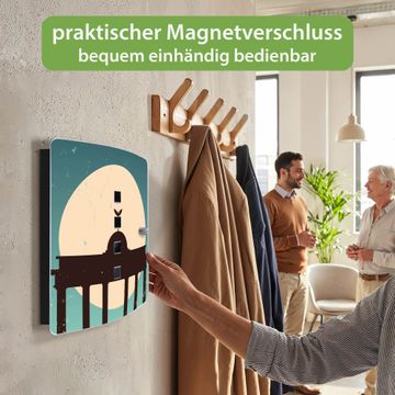 Funktion / Nutzen: Die leicht geschwungene Edelstahltür ist mit einer hochwertigen Motivfolie und dem Motiv Motiv City Poster Berlin kaschiert. Ein praktischer Magnetverschluss ermöglicht Ihnen ein schnelles Öffnen und Schließen. Befestigt wird der Schlüsselkasten an 2 Stellen auf der Rückseite, passendes Montagematerial fügen wir bereits bei.