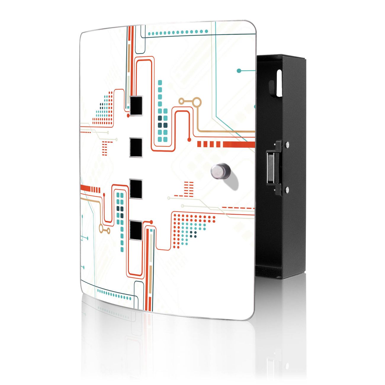 Funktion / Nutzen: Die leicht geschwungene Edelstahltür ist mit einer hochwertigen Motivfolie und dem Motiv Motiv Digitales Netzwerk 2 kaschiert. Ein praktischer Magnetverschluss ermöglicht Ihnen ein schnelles Öffnen und Schließen. Befestigt wird der Schlüsselkasten an 2 Stellen auf der Rückseite, passendes Montagematerial fügen wir bereits bei.
