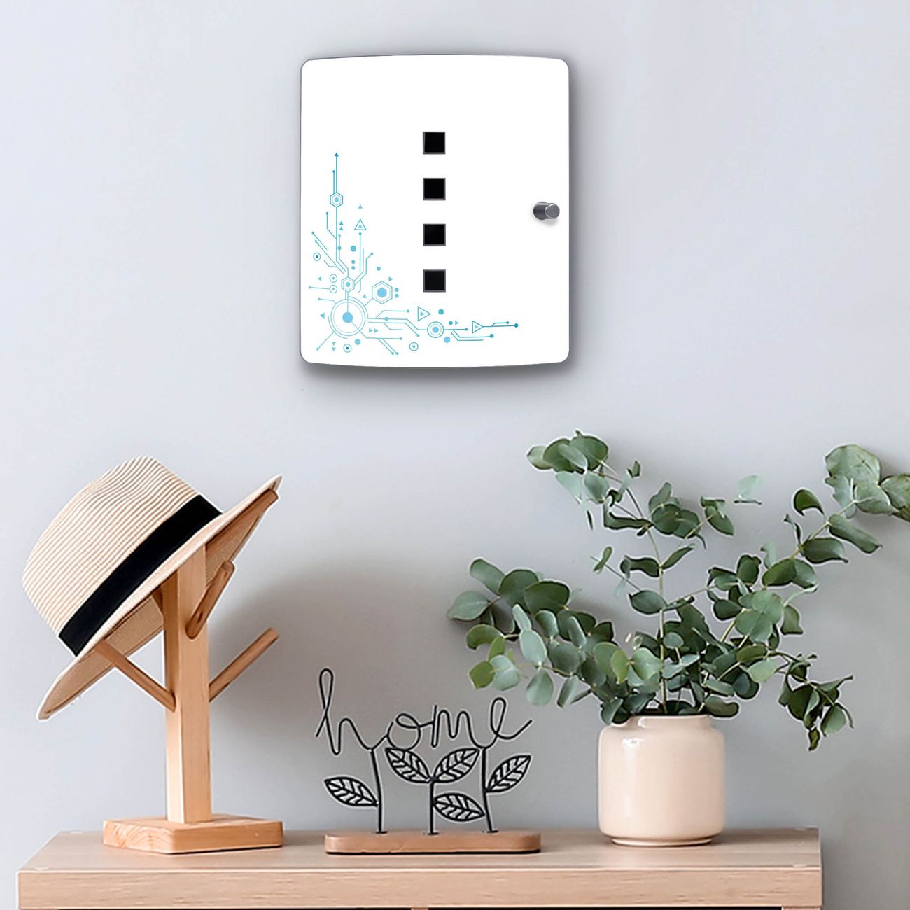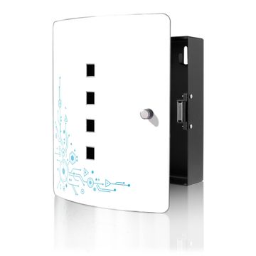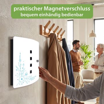 Funktion / Nutzen: Die leicht geschwungene Edelstahltür ist mit einer hochwertigen Motivfolie und dem Motiv Motiv Digitales Netzwerk kaschiert. Ein praktischer Magnetverschluss ermöglicht Ihnen ein schnelles Öffnen und Schließen. Befestigt wird der Schlüsselkasten an 2 Stellen auf der Rückseite, passendes Montagematerial fügen wir bereits bei.