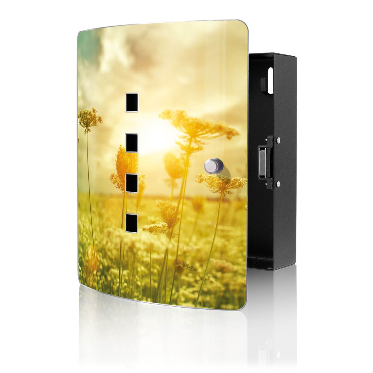 Funktion / Nutzen: Die leicht geschwungene Edelstahltür ist mit einer hochwertigen Motivfolie und dem Motiv Motiv Dill im Sonnenlicht kaschiert. Ein praktischer Magnetverschluss ermöglicht Ihnen ein schnelles Öffnen und Schließen. Befestigt wird der Schlüsselkasten an 2 Stellen auf der Rückseite, passendes Montagematerial fügen wir bereits bei.