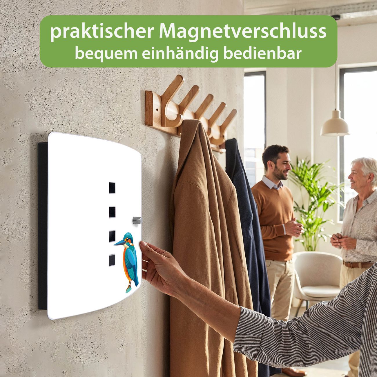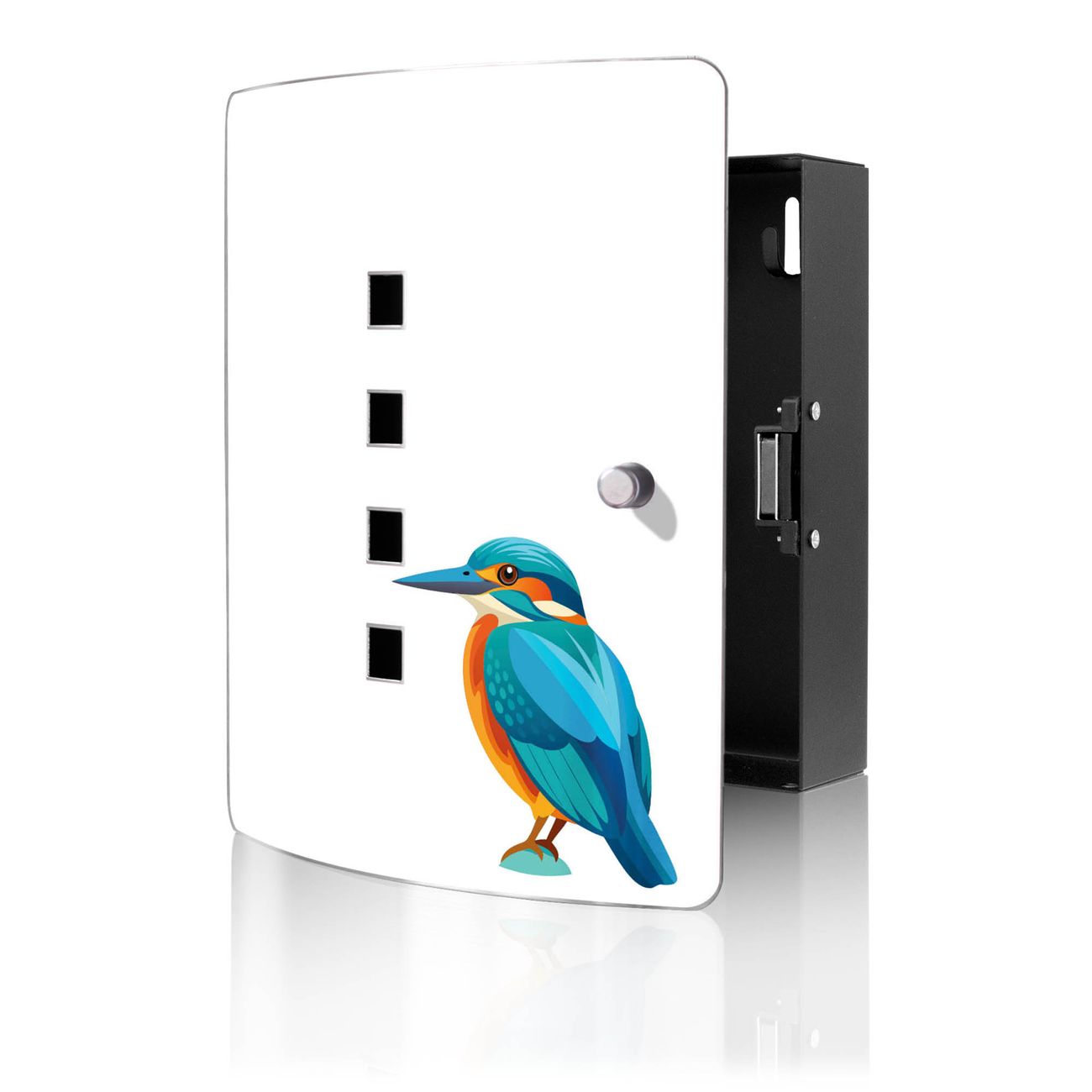 Funktion / Nutzen: Die leicht geschwungene Edelstahltür ist mit einer hochwertigen Motivfolie und dem Motiv Motiv Eisvogel Illustration kaschiert. Ein praktischer Magnetverschluss ermöglicht Ihnen ein schnelles Öffnen und Schließen. Befestigt wird der Schlüsselkasten an 2 Stellen auf der Rückseite, passendes Montagematerial fügen wir bereits bei.