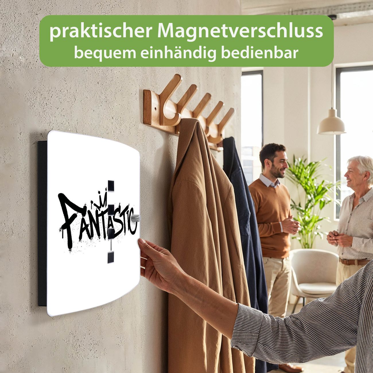 Funktion / Nutzen: Die leicht geschwungene Edelstahltür ist mit einer hochwertigen Motivfolie und dem Motiv Motiv Fantastic Graffiti kaschiert. Ein praktischer Magnetverschluss ermöglicht Ihnen ein schnelles Öffnen und Schließen. Befestigt wird der Schlüsselkasten an 2 Stellen auf der Rückseite, passendes Montagematerial fügen wir bereits bei.