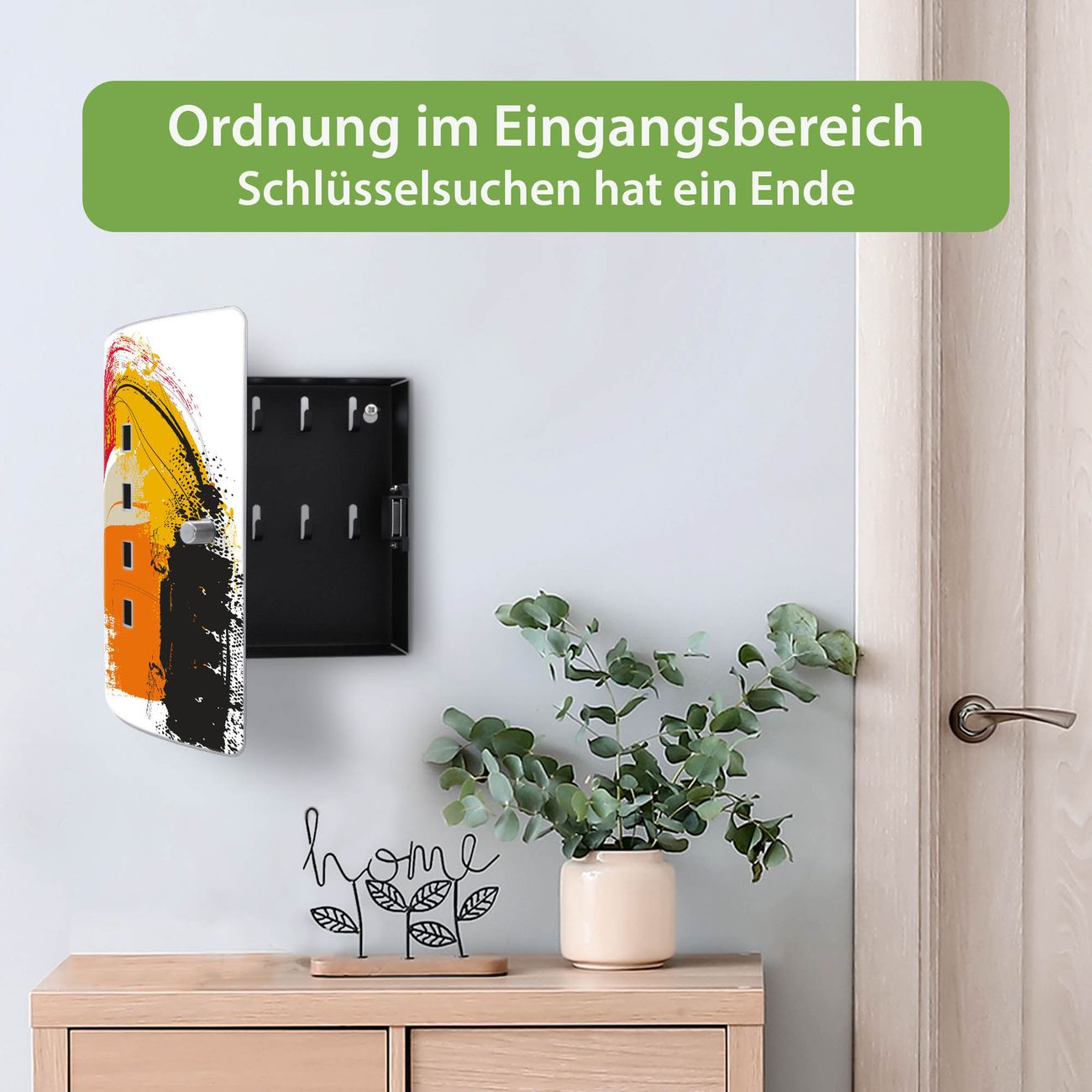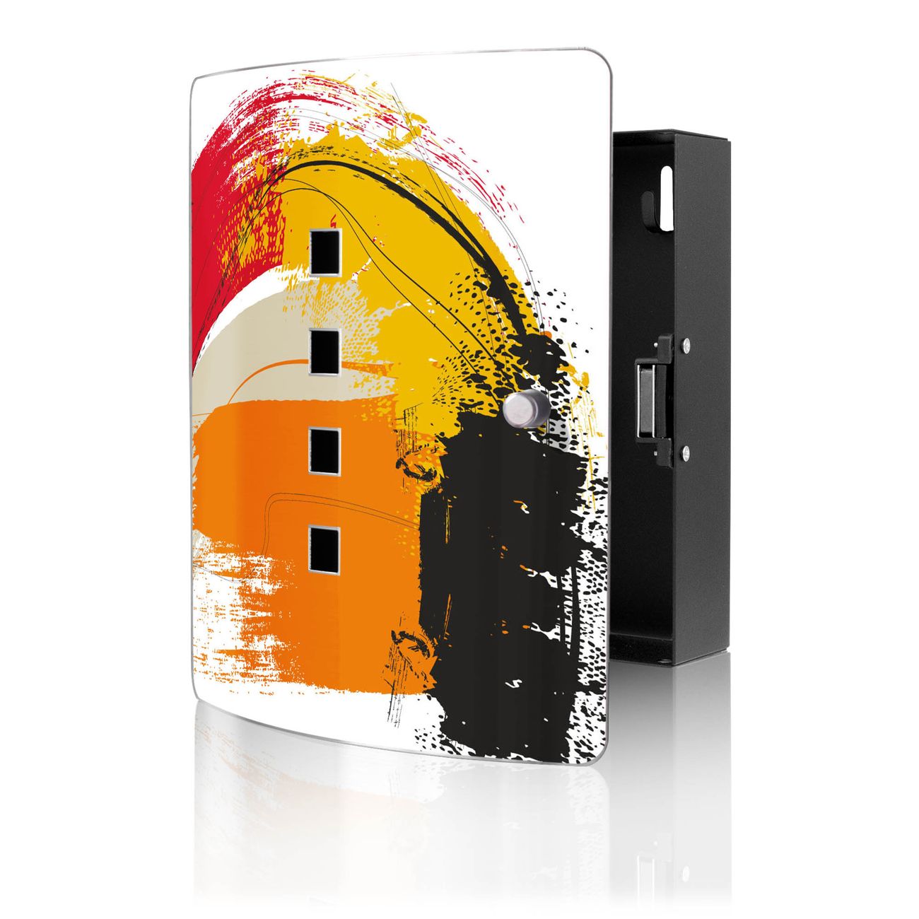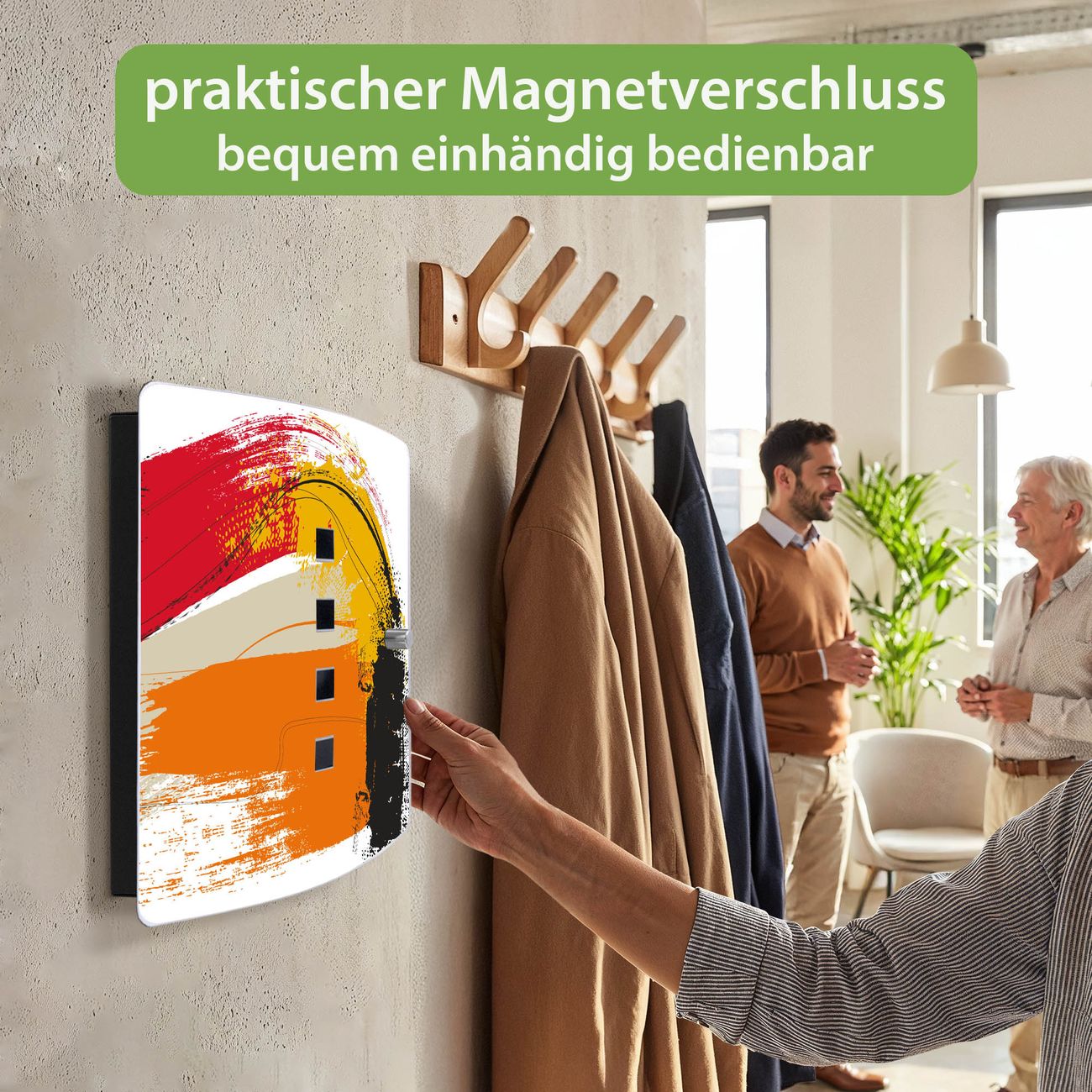 Funktion / Nutzen: Die leicht geschwungene Edelstahltür ist mit einer hochwertigen Motivfolie und dem Motiv Motiv Farbexplosion kaschiert. Ein praktischer Magnetverschluss ermöglicht Ihnen ein schnelles Öffnen und Schließen. Befestigt wird der Schlüsselkasten an 2 Stellen auf der Rückseite, passendes Montagematerial fügen wir bereits bei.
