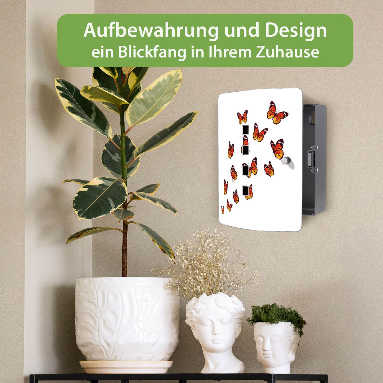 Funktion / Nutzen: Die leicht geschwungene Edelstahltür ist mit einer hochwertigen Motivfolie und dem Motiv Motiv Farbige Schmetterlinge kaschiert. Ein praktischer Magnetverschluss ermöglicht Ihnen ein schnelles Öffnen und Schließen. Befestigt wird der Schlüsselkasten an 2 Stellen auf der Rückseite, passendes Montagematerial fügen wir bereits bei.
