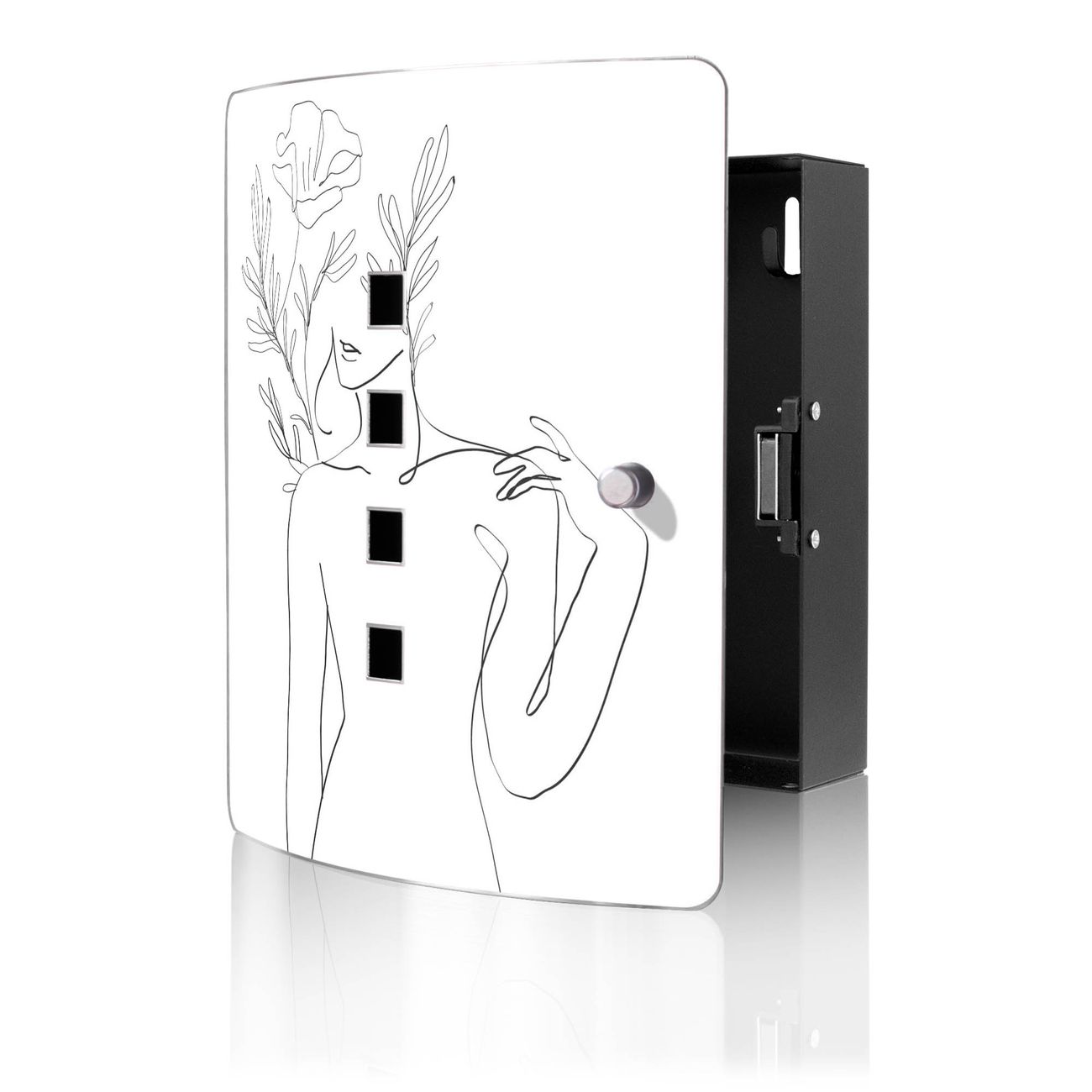 Funktion / Nutzen: Die leicht geschwungene Edelstahltür ist mit einer hochwertigen Motivfolie und dem Motiv Motiv Feminin Floral Lineart 2 kaschiert. Ein praktischer Magnetverschluss ermöglicht Ihnen ein schnelles Öffnen und Schließen. Befestigt wird der Schlüsselkasten an 2 Stellen auf der Rückseite, passendes Montagematerial fügen wir bereits bei.