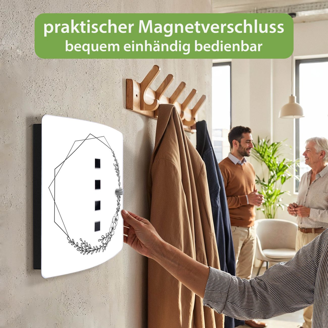 Funktion / Nutzen: Die leicht geschwungene Edelstahltür ist mit einer hochwertigen Motivfolie und dem Motiv Motiv Floral Geometric Frame kaschiert. Ein praktischer Magnetverschluss ermöglicht Ihnen ein schnelles Öffnen und Schließen. Befestigt wird der Schlüsselkasten an 2 Stellen auf der Rückseite, passendes Montagematerial fügen wir bereits bei.