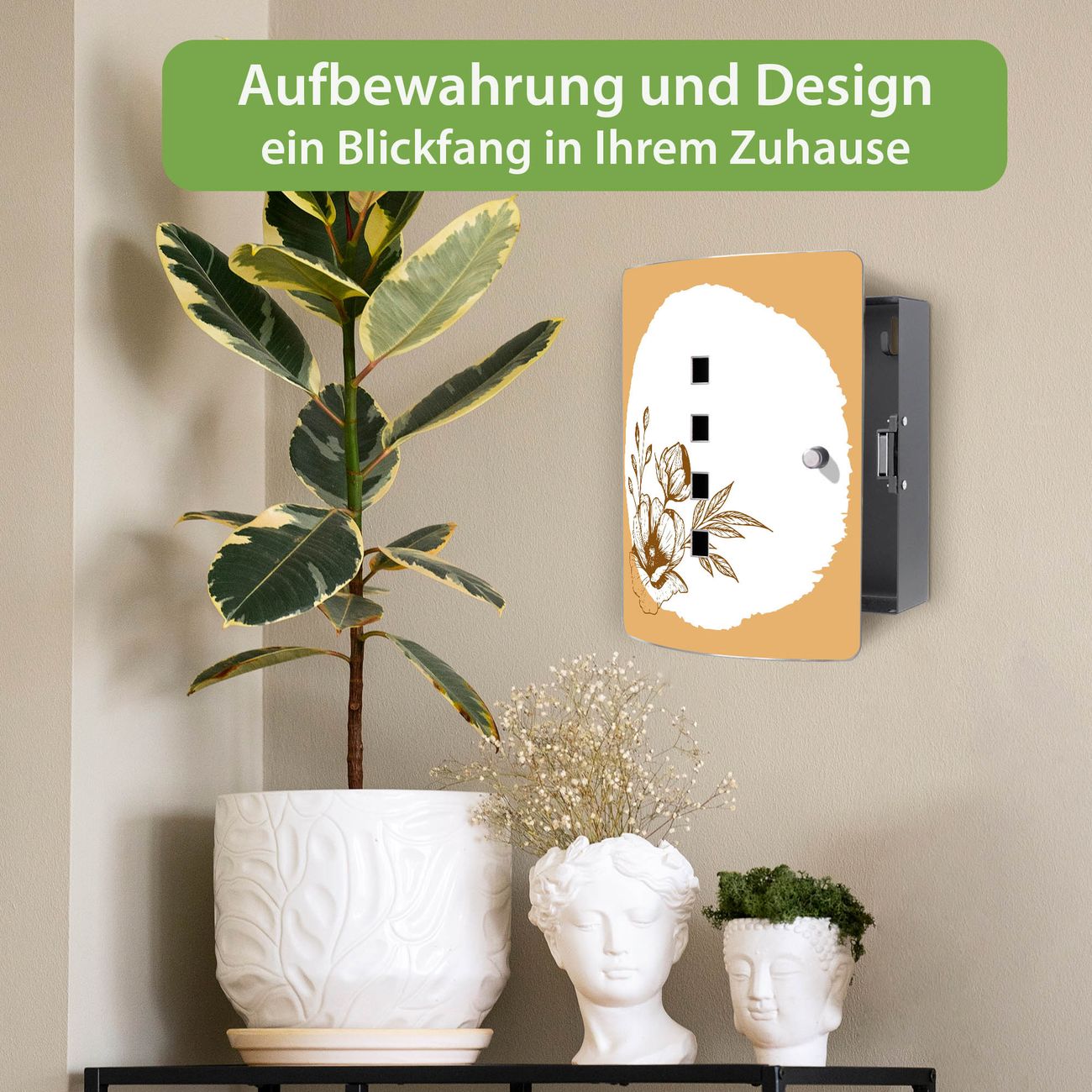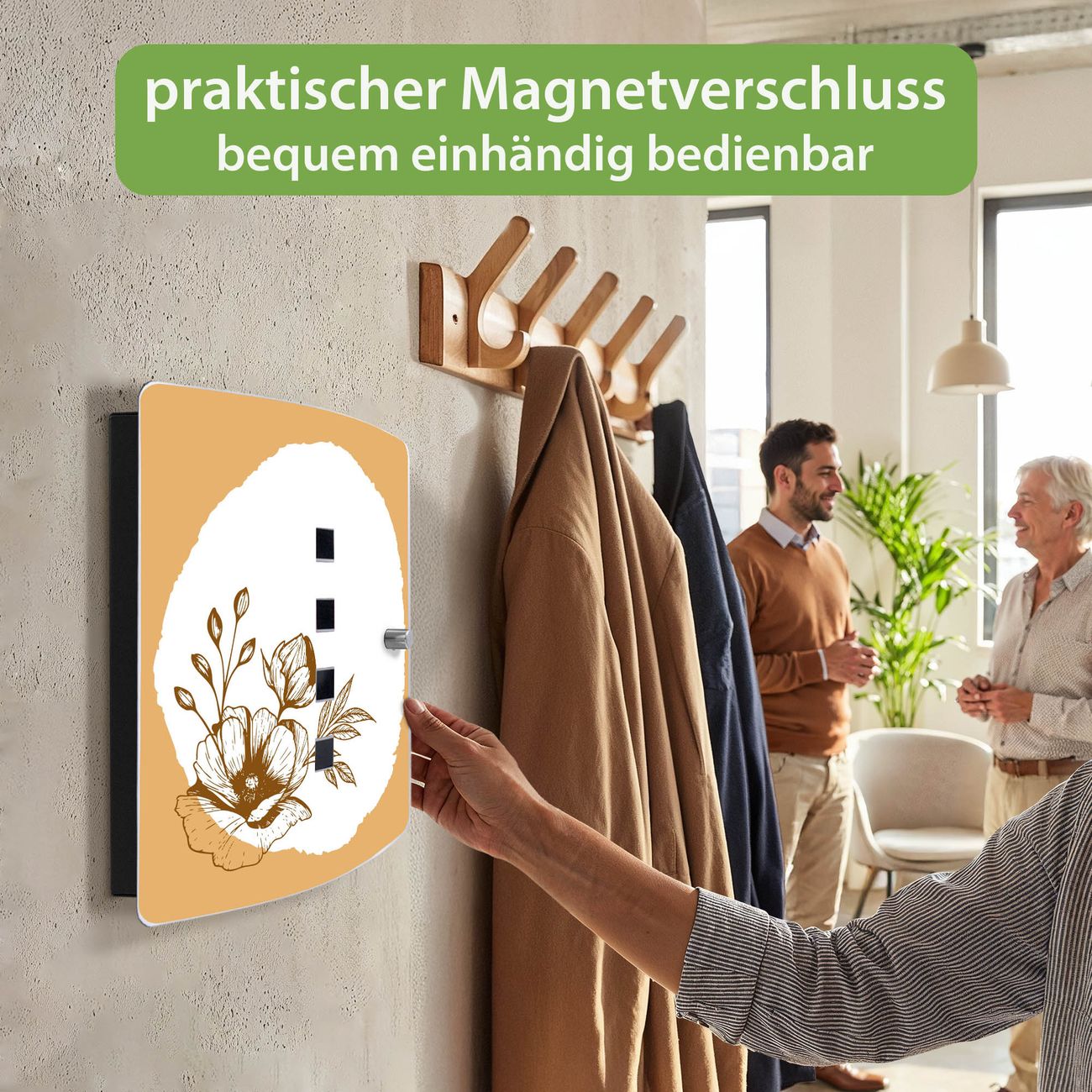Funktion / Nutzen: Die leicht geschwungene Edelstahltür ist mit einer hochwertigen Motivfolie und dem Motiv Motiv Florale Eleganz 2 kaschiert. Ein praktischer Magnetverschluss ermöglicht Ihnen ein schnelles Öffnen und Schließen. Befestigt wird der Schlüsselkasten an 2 Stellen auf der Rückseite, passendes Montagematerial fügen wir bereits bei.