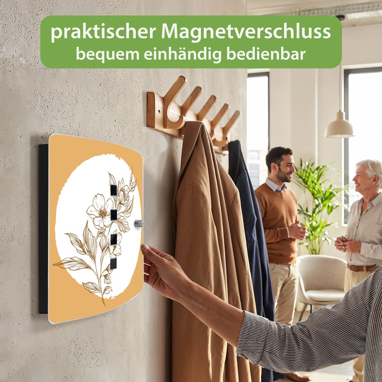 Funktion / Nutzen: Die leicht geschwungene Edelstahltür ist mit einer hochwertigen Motivfolie und dem Motiv Motiv Florale Skizze kaschiert. Ein praktischer Magnetverschluss ermöglicht Ihnen ein schnelles Öffnen und Schließen. Befestigt wird der Schlüsselkasten an 2 Stellen auf der Rückseite, passendes Montagematerial fügen wir bereits bei.