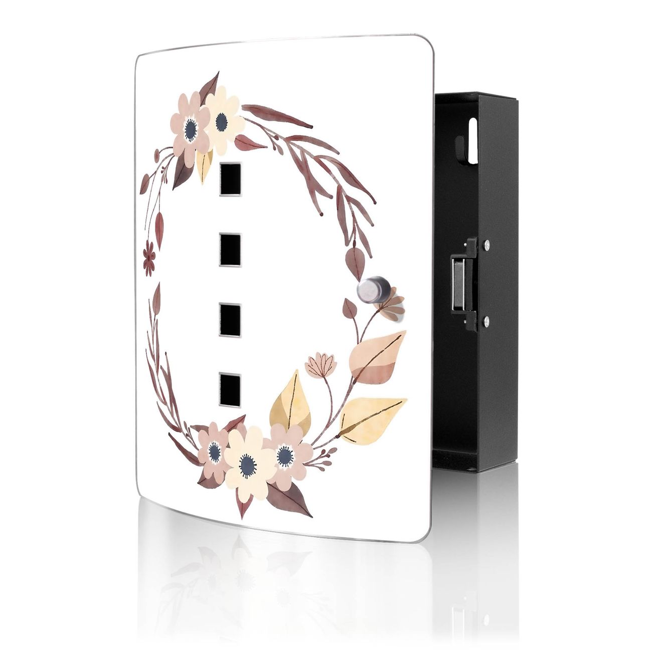 Funktion / Nutzen: Die leicht geschwungene Edelstahltür ist mit einer hochwertigen Motivfolie und dem Motiv Motiv Floraler Aquarellkranz kaschiert. Ein praktischer Magnetverschluss ermöglicht Ihnen ein schnelles Öffnen und Schließen. Befestigt wird der Schlüsselkasten an 2 Stellen auf der Rückseite, passendes Montagematerial fügen wir bereits bei.