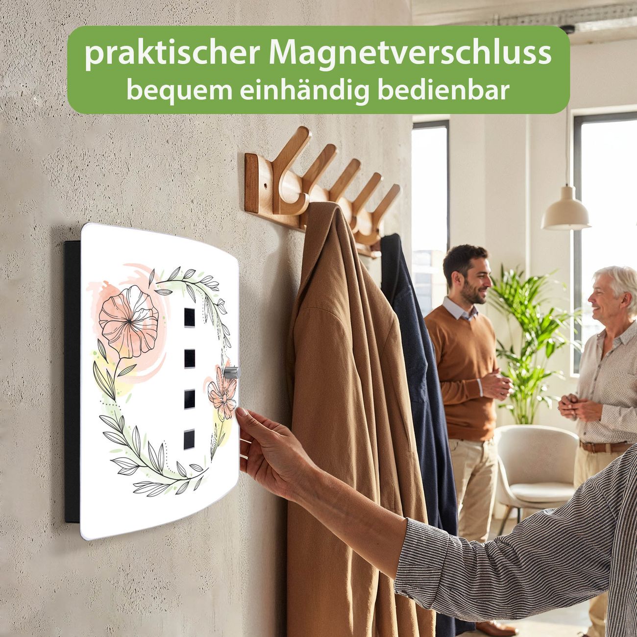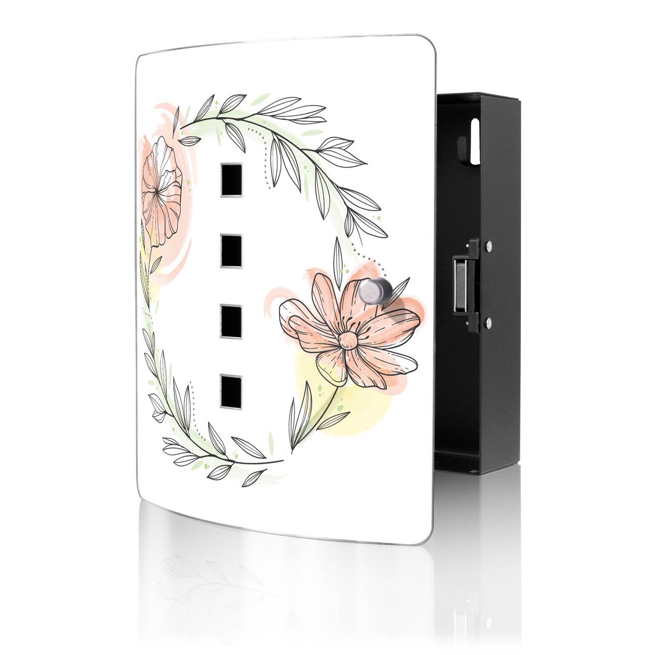 Funktion / Nutzen: Die leicht geschwungene Edelstahltür ist mit einer hochwertigen Motivfolie und dem Motiv Motiv Floraler Blütenkranz kaschiert. Ein praktischer Magnetverschluss ermöglicht Ihnen ein schnelles Öffnen und Schließen. Befestigt wird der Schlüsselkasten an 2 Stellen auf der Rückseite, passendes Montagematerial fügen wir bereits bei.