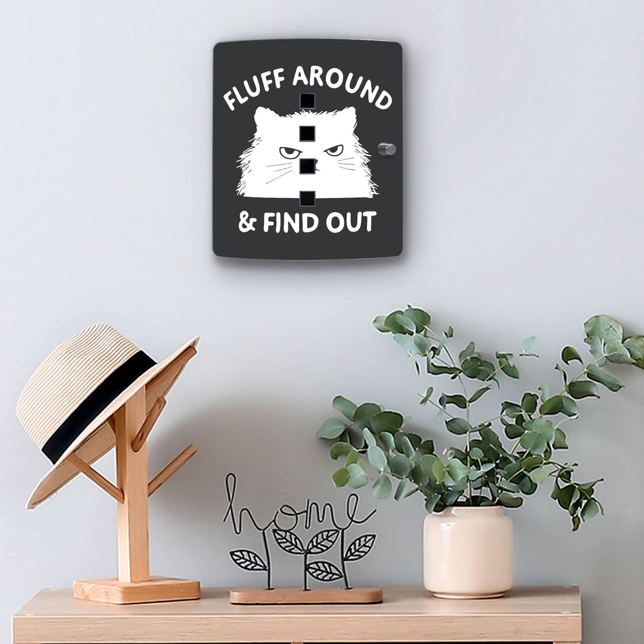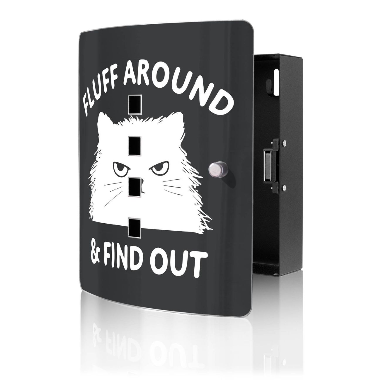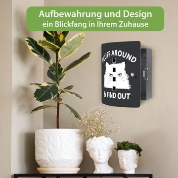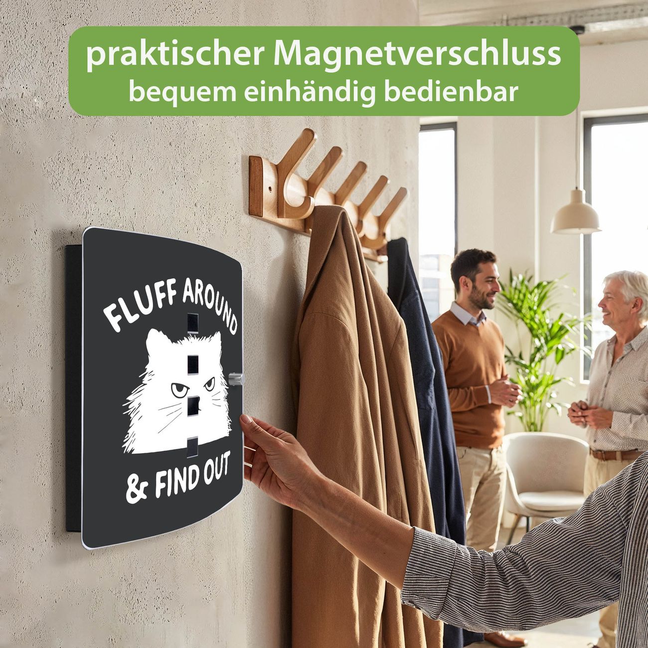 Funktion / Nutzen: Die leicht geschwungene Edelstahltür ist mit einer hochwertigen Motivfolie und dem Motiv Motiv Fluff Around Cat kaschiert. Ein praktischer Magnetverschluss ermöglicht Ihnen ein schnelles Öffnen und Schließen. Befestigt wird der Schlüsselkasten an 2 Stellen auf der Rückseite, passendes Montagematerial fügen wir bereits bei.