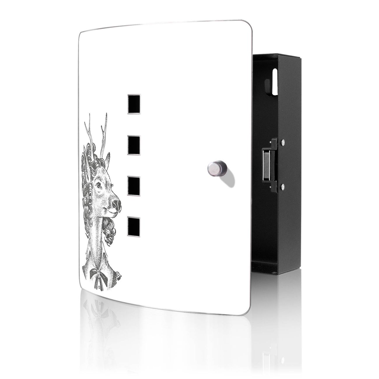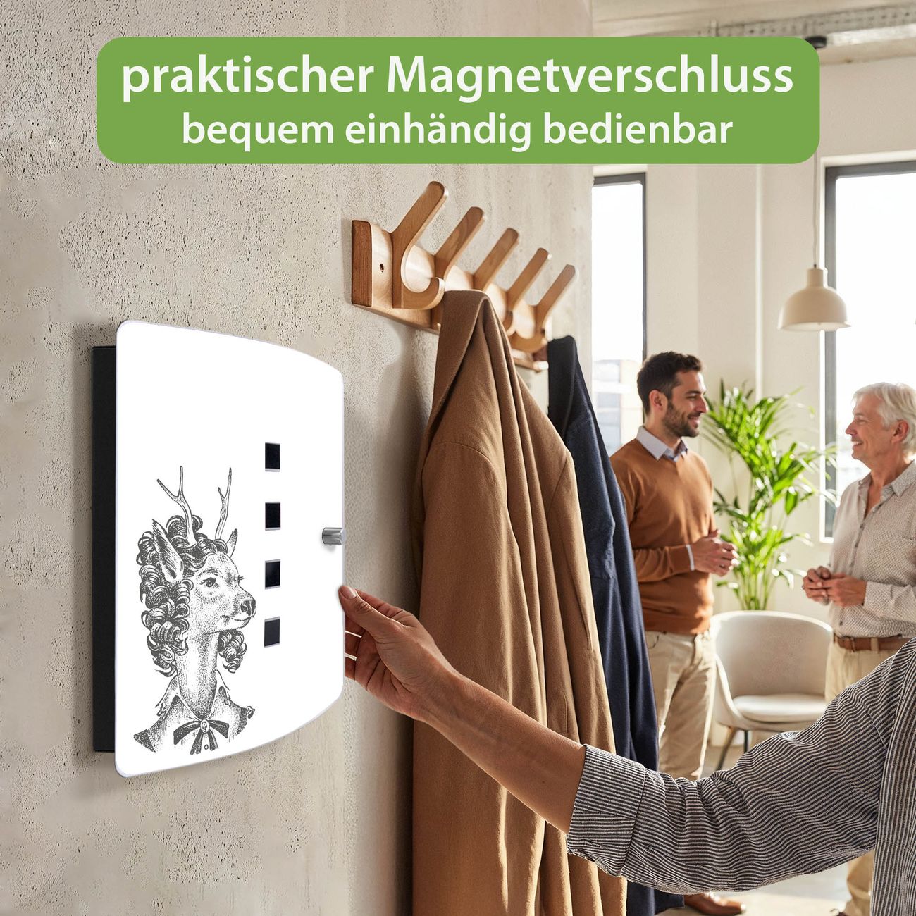 Funktion / Nutzen: Die leicht geschwungene Edelstahltür ist mit einer hochwertigen Motivfolie und dem Motiv Motiv Frau Hirsch 2 kaschiert. Ein praktischer Magnetverschluss ermöglicht Ihnen ein schnelles Öffnen und Schließen. Befestigt wird der Schlüsselkasten an 2 Stellen auf der Rückseite, passendes Montagematerial fügen wir bereits bei.