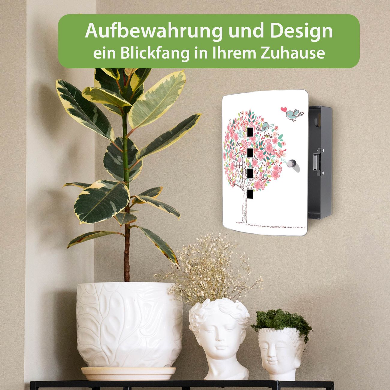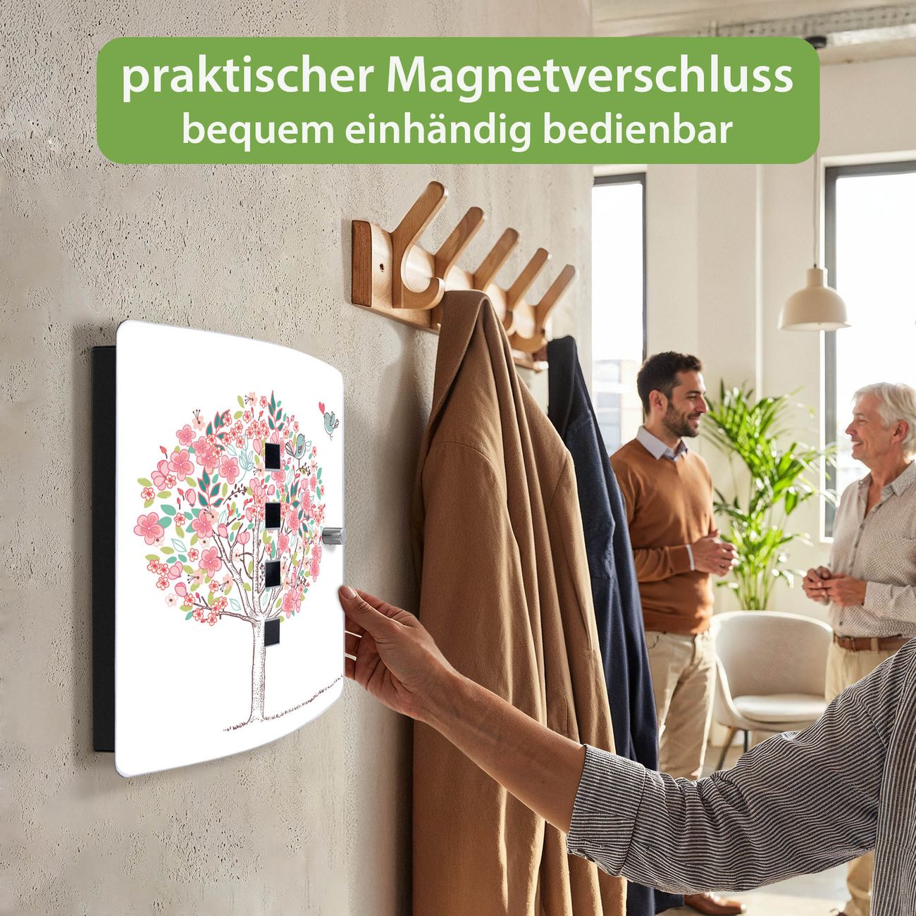 Funktion / Nutzen: Die leicht geschwungene Edelstahltür ist mit einer hochwertigen Motivfolie und dem Motiv Motiv Frühlingsgefühle kaschiert. Ein praktischer Magnetverschluss ermöglicht Ihnen ein schnelles Öffnen und Schließen. Befestigt wird der Schlüsselkasten an 2 Stellen auf der Rückseite, passendes Montagematerial fügen wir bereits bei.