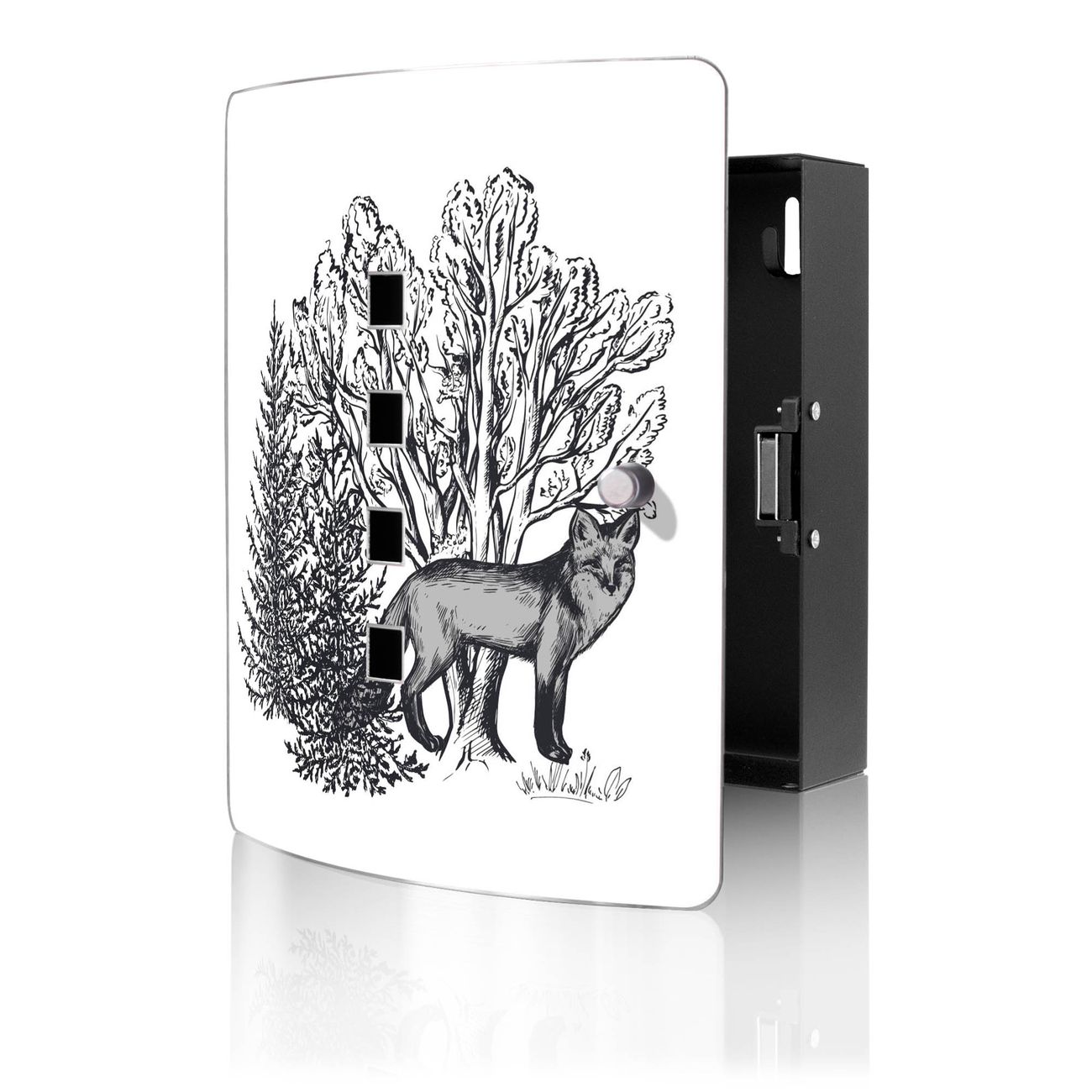 Funktion / Nutzen: Die leicht geschwungene Edelstahltür ist mit einer hochwertigen Motivfolie und dem Motiv Motiv Fuchs in Schwarz-Weiß kaschiert. Ein praktischer Magnetverschluss ermöglicht Ihnen ein schnelles Öffnen und Schließen. Befestigt wird der Schlüsselkasten an 2 Stellen auf der Rückseite, passendes Montagematerial fügen wir bereits bei.